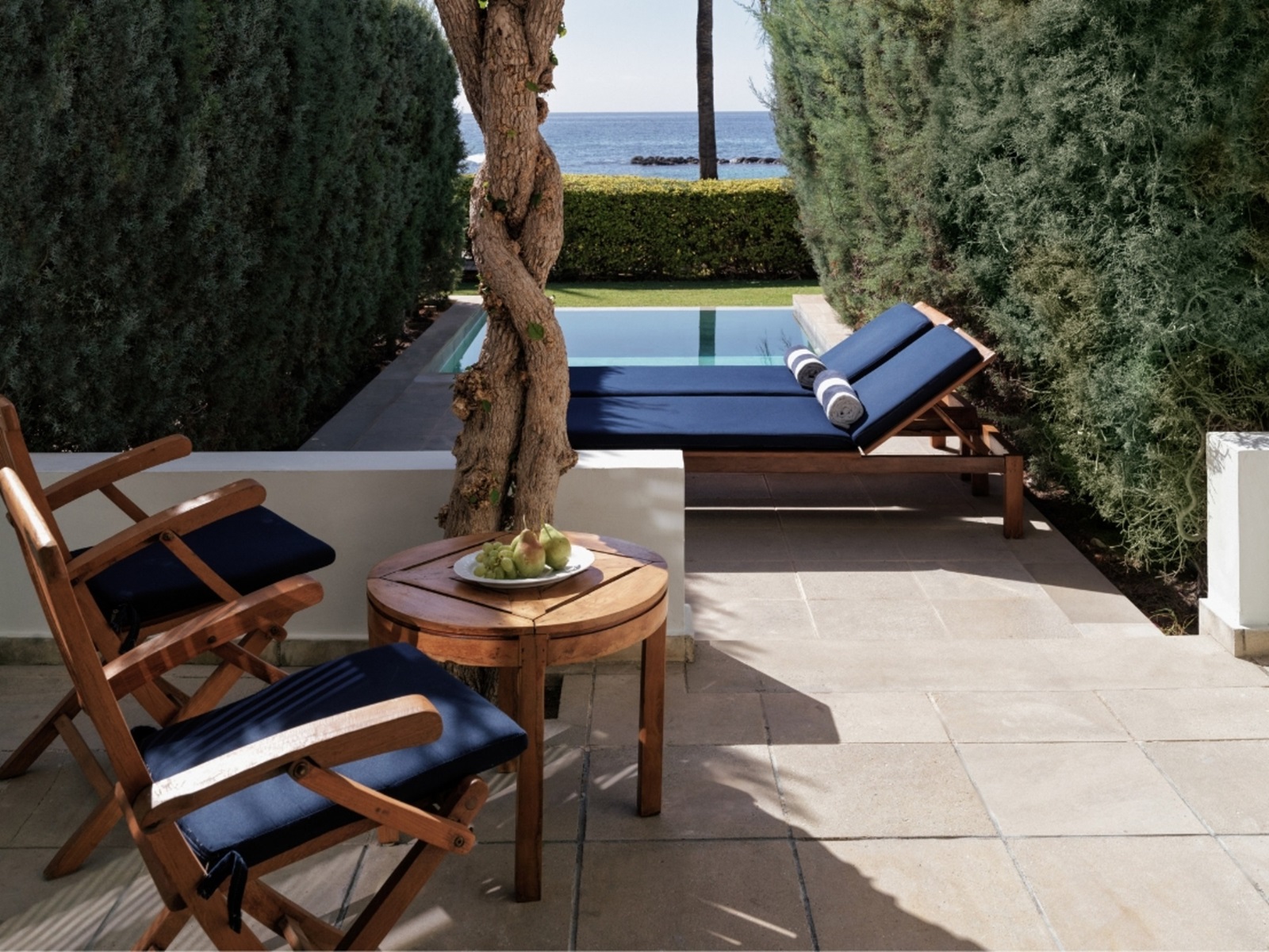 studio suites (35 m²) situées au rez-de-chaussée avec séjour/chambre à coucher, terrasse avec chaises longues, piscine privée (3,2m x 4m) et vue mer