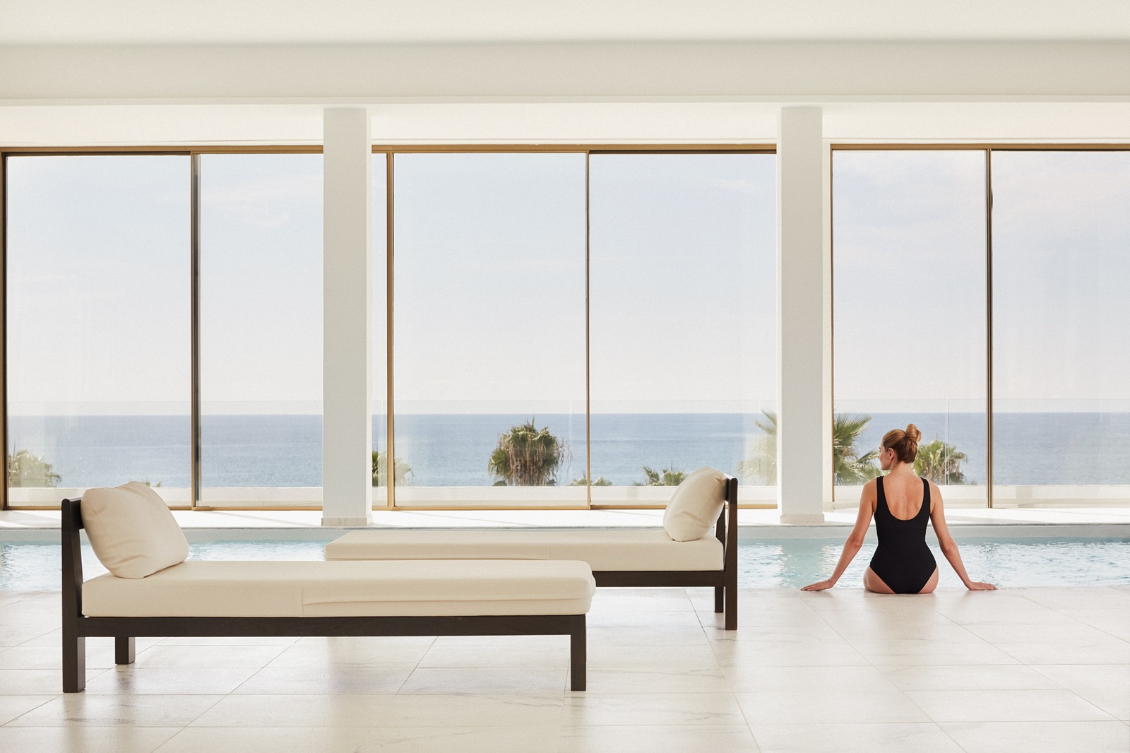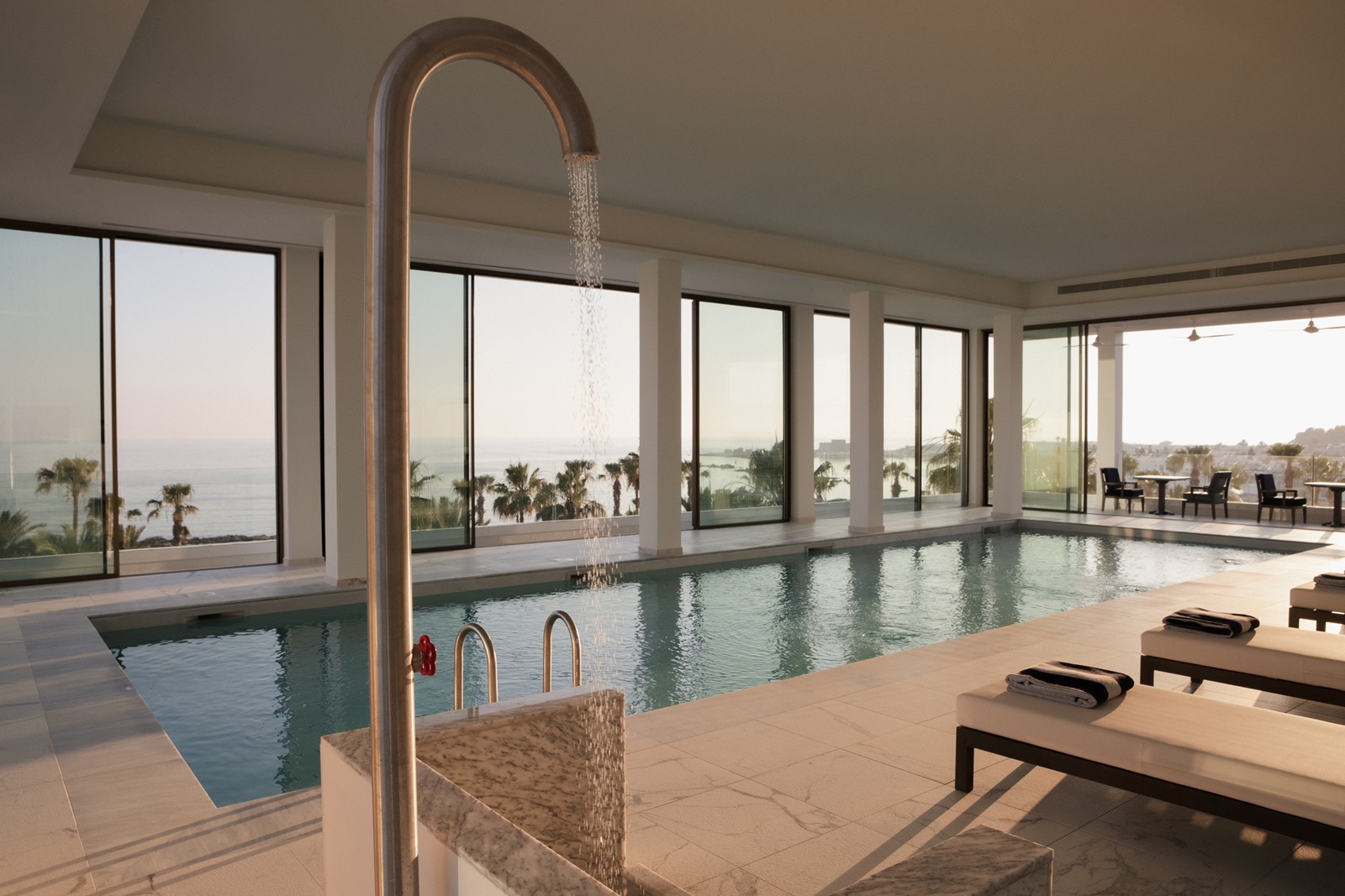 centre de bien-être 'Ouranos Wellbeing Spa' : piscine intérieure, sauna, espace détente, massages et soins de beauté.