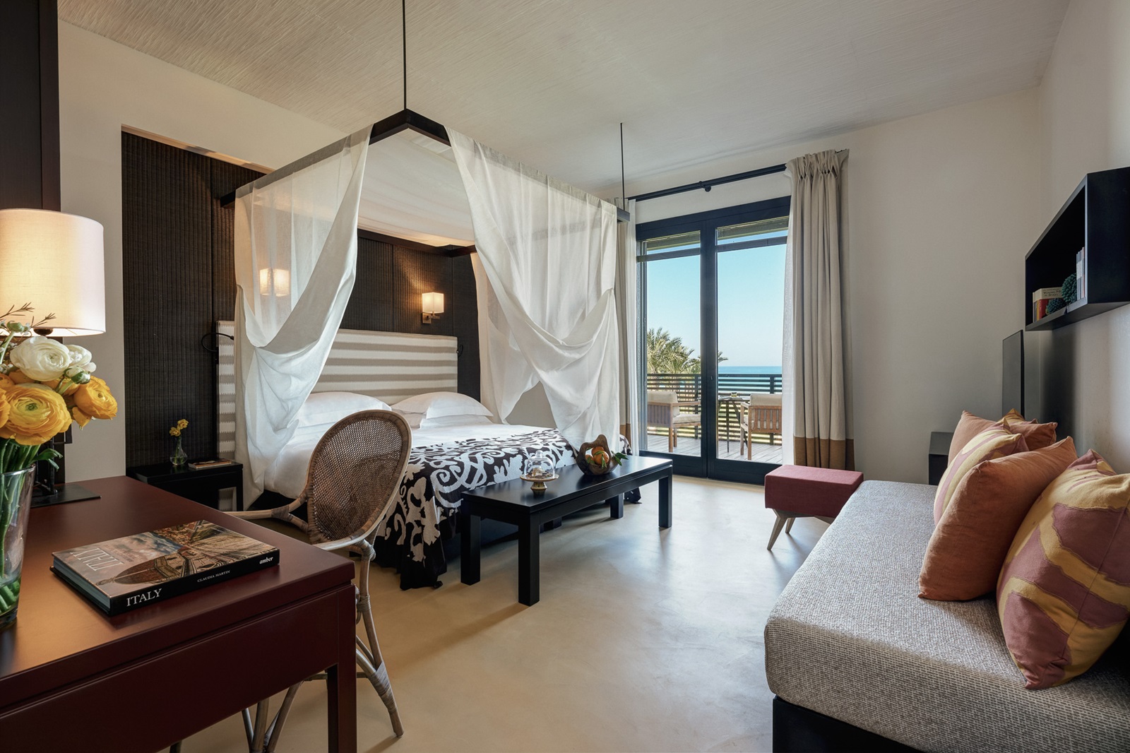 toutes les chambres disposent d'un lit à baldaquin, salle de bain spacieuse avec baignoire, douche, sèche-cheveux, coin salon, wifi, facilités à thé et café (sur demande), télévision à écran plat, téléphone, minibar (€),coffre-fort, climatisation et balcon ou terrasse avec vue sur mer
