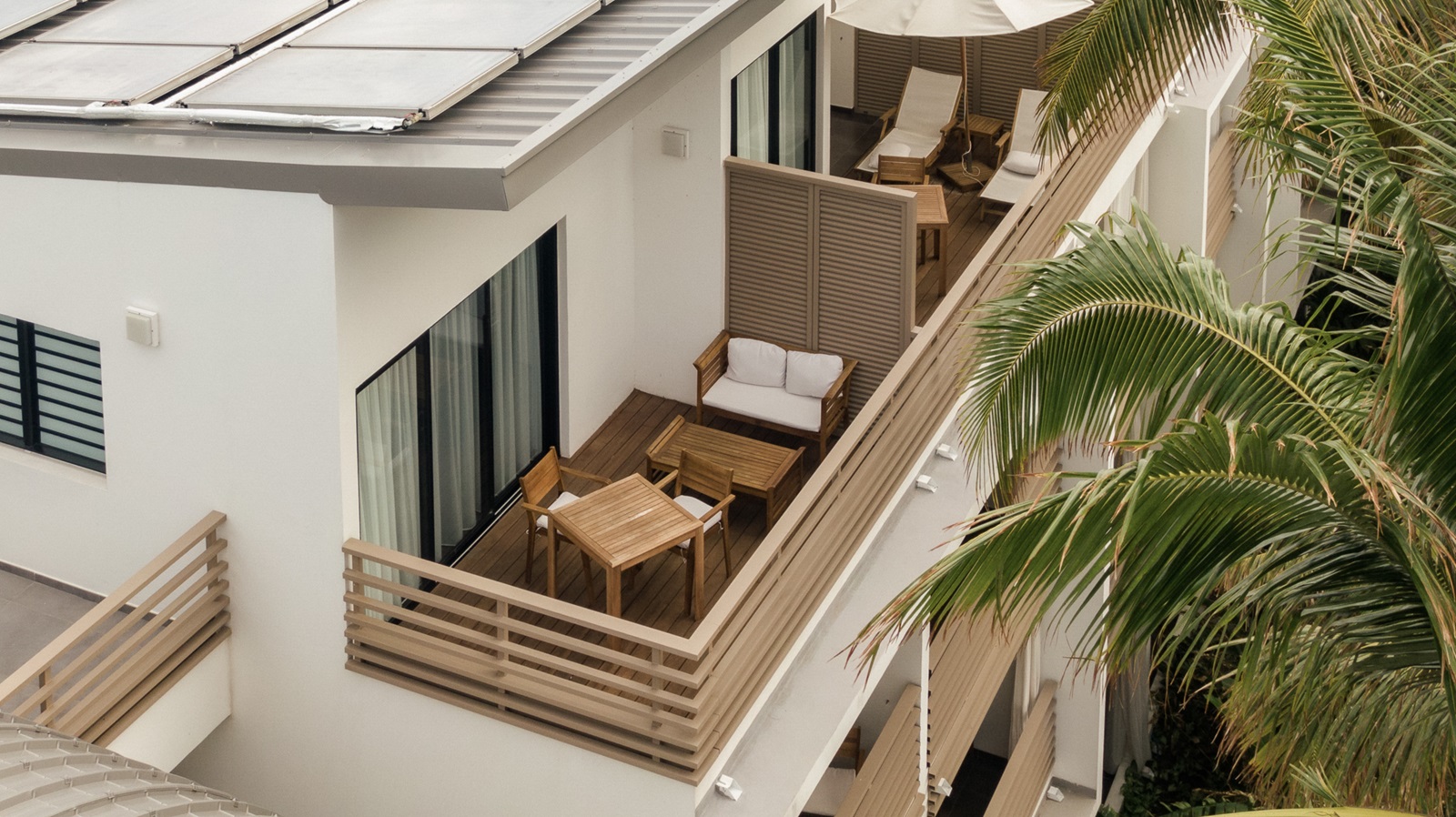 chambres rooftop (40 m²) situées à l’étage supérieur, avec un balcon spacieux (15 m²) et vue jardin