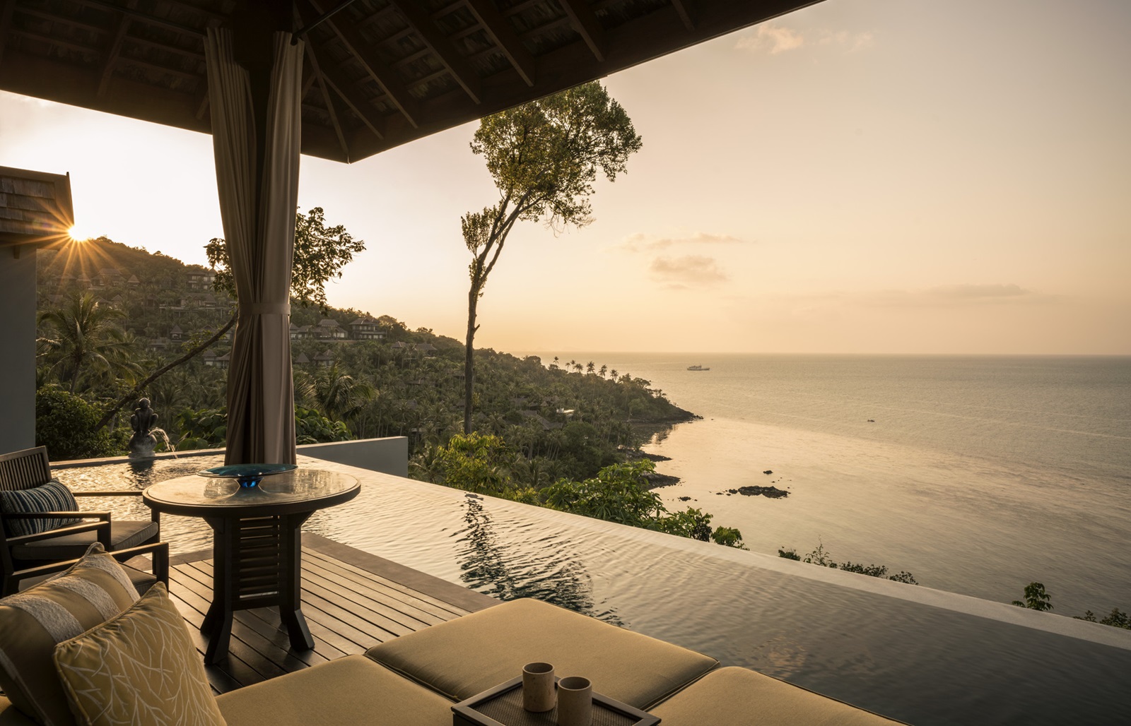 Ce Four Seasons est situé sur une pente parsemée de palmiers qui surplombe le golfe de Thaïlande. Des plages immaculées, une flore tropicale et des eaux azur forment la toile de fond. L'hôtel lui-même se compose d'un groupe de villas avec piscine, basées sur l'architecture traditionnelle du sud de la Thaïlande et présentant des œuvres d'art sur mesure. A voir également : le spa, installé dans une cocoteraie. Assurez-vous d'essayer le massage Kala à la noix de coco, qui utilise des coquilles de noix de coco lisses pour pétrir doucement les muscles, tandis que l'huile de noix de coco parfumée apaise la peau.