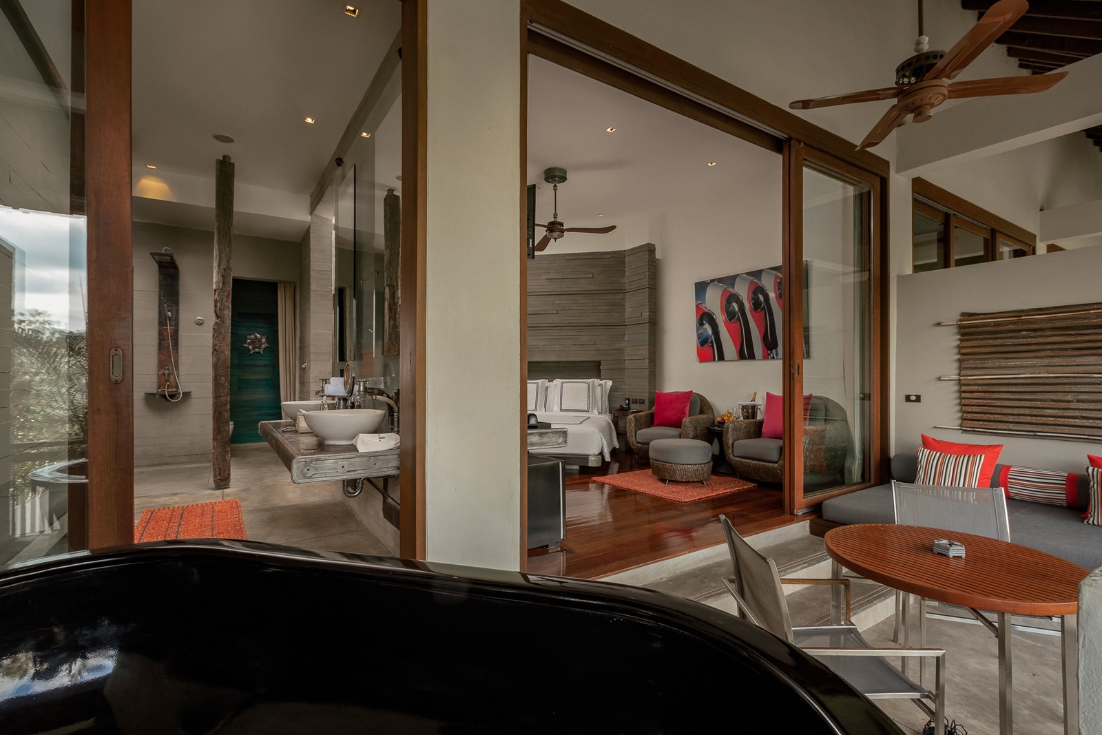 Private Pool Suites (112 m²) avec grande salle de bains, baignoire sur la terrasse, patio avec chaises longues, piscine privative et vue jardin