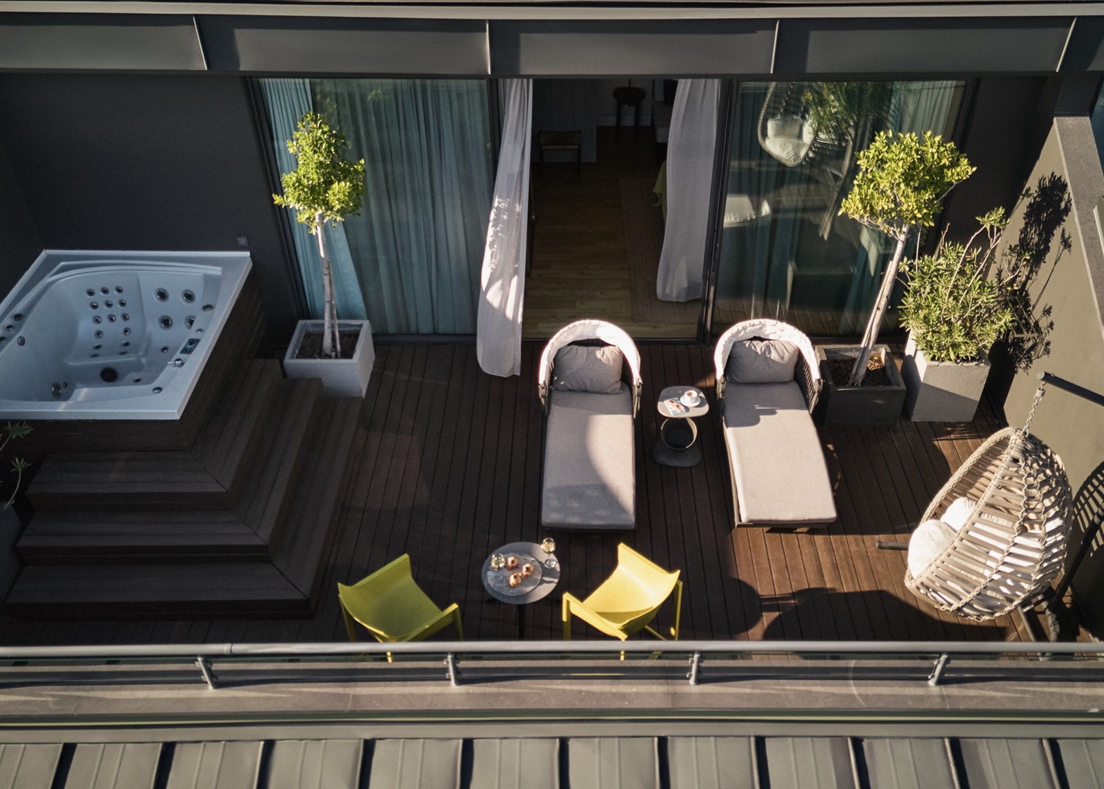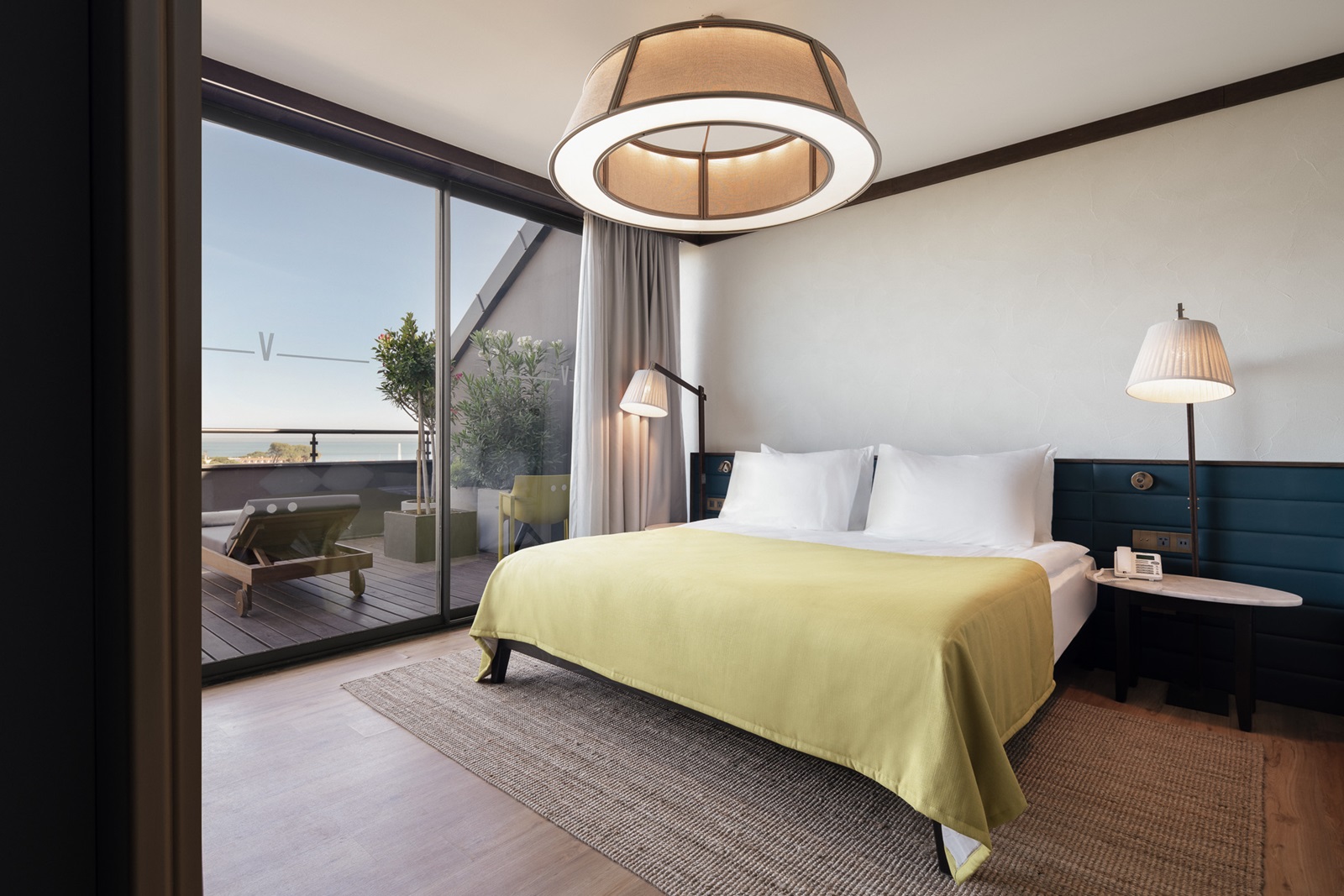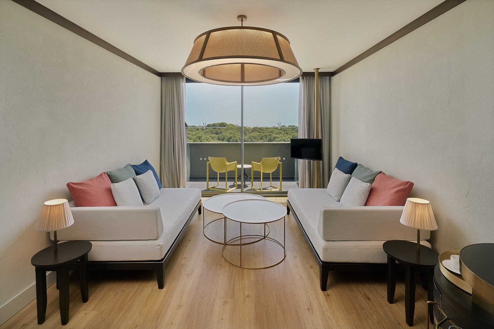 chambres de luxe (30 m²) situées dans le bâtiment principal avec grande terrasse (30 m²) avec jacuzzi, vue mer latérale et privilèges supplémentaires : e.a. enregistrement personnalisé, 1 dîner gratuit dans chaque restaurant à la carte (à l'exception du Carino et du Wen Teppanyaki, sur réservation et selon disponibilité), maxibar quotidien