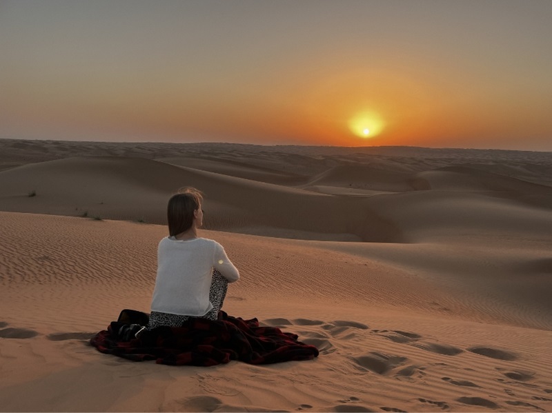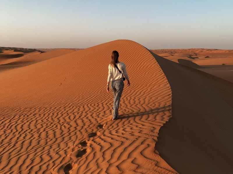 « Oman regorge de moments forts, mais certains d'entre eux resteront gravés dans ma mémoire. Le yoga au lever du soleil à 2 000 mètres d'altitude, au milieu d'un paysage spectaculaire, a été inoubliable, tout comme l'observation des étoiles dans le même cadre, sans aucune pollution lumineuse. La randonnée que nous avons faite à Jabal Akhdar, la « 3 village walk », nous a fait passer par des villages authentiques reliés par des systèmes d'irrigation. Notre guide local, lui-même originaire de cette région montagneuse, nous a fièrement raconté son enfance dans ces zones inhospitalières et la vie à Oman.
