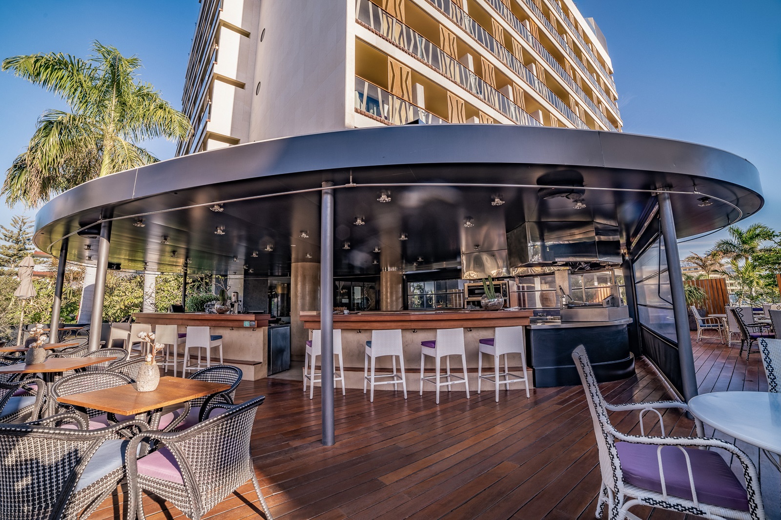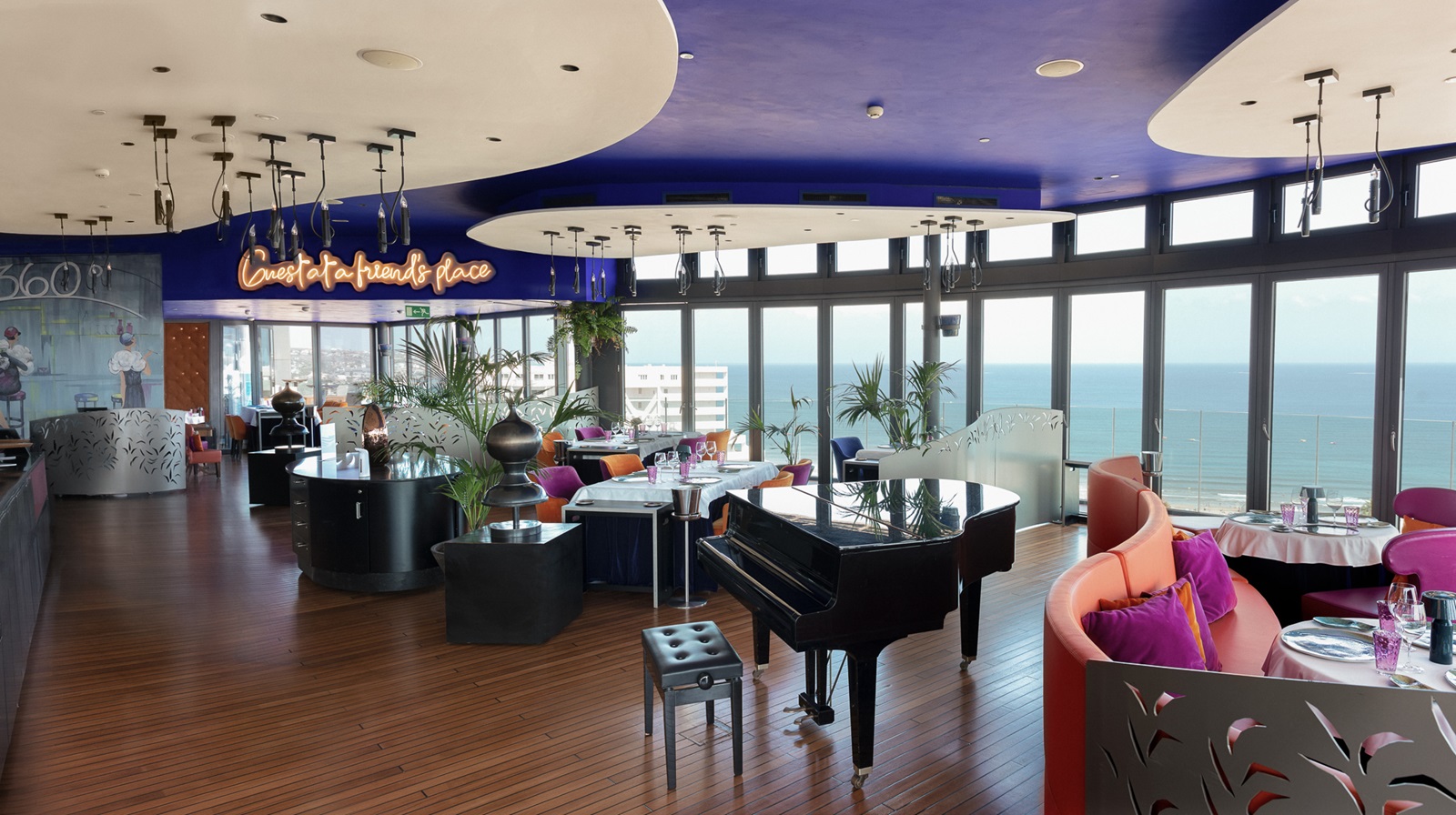 restaurant principal '360°' à l'étage supérieur avec vue 360° sur les montagnes, les dunes, la plage et la mer (produits locaux)