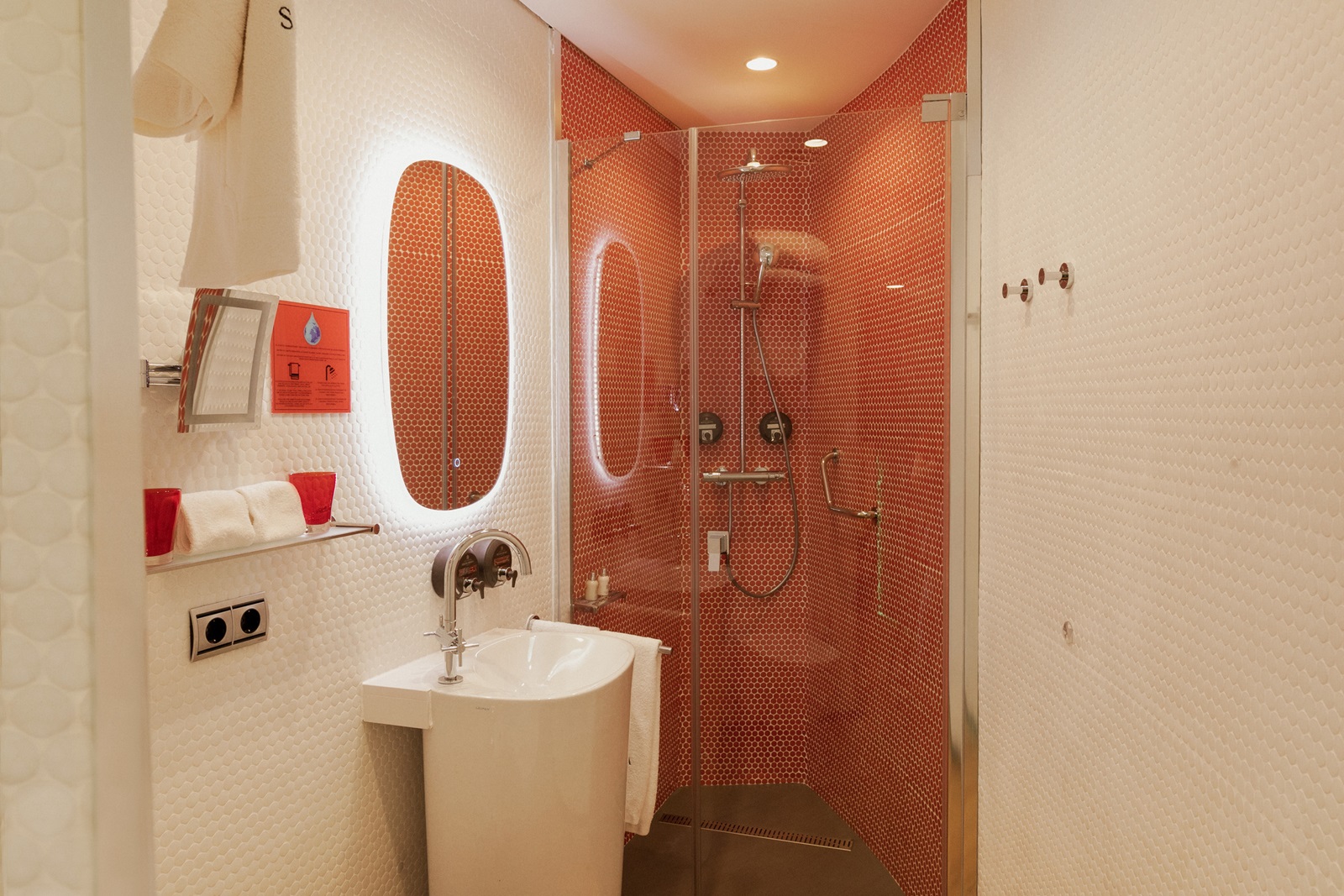 toutes les chambres disposent d'une douche à effet pluie, sortie de bain et pantoufles, sèche-cheveux, téléphone, TV satellite, wifi, minibar (€), percolateur à café Lavazza, distributeur d'eau, coffre-fort, parquet, climatisation, balcon