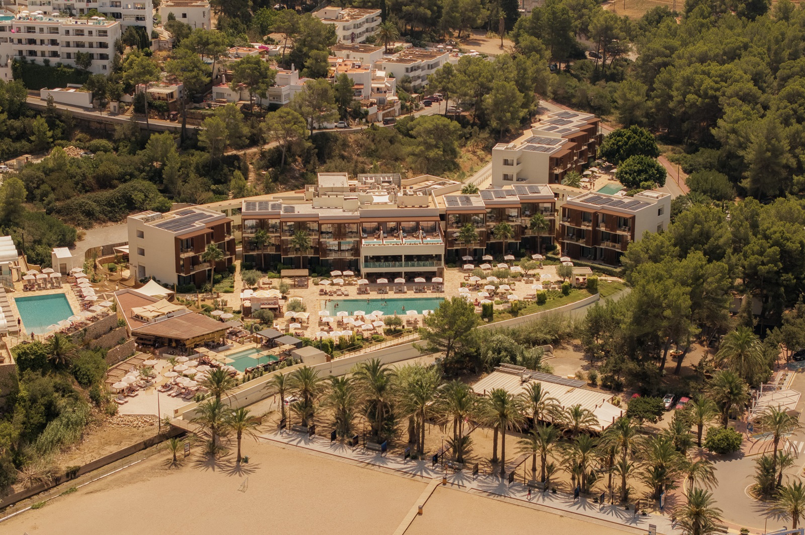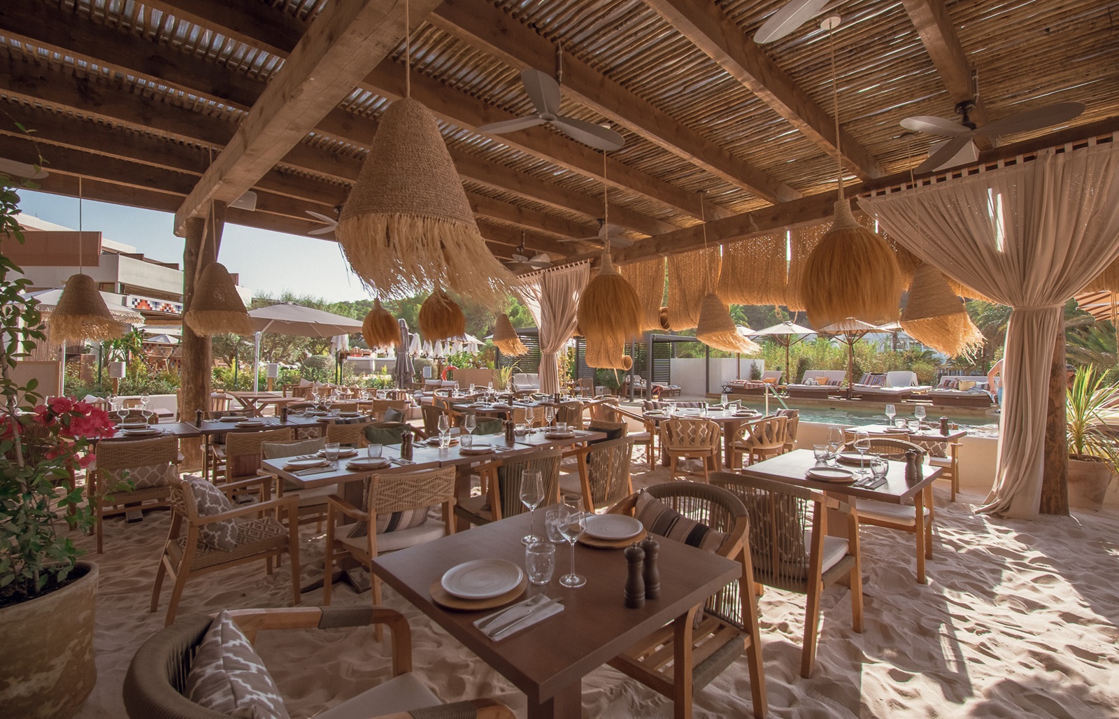 Beach club exclusif ‘Cala San Miguel Beach House’ avec piscine, restaurant et musique live (dépense minimale de 65 € par personne pour utiliser la piscine et les chaises longues)