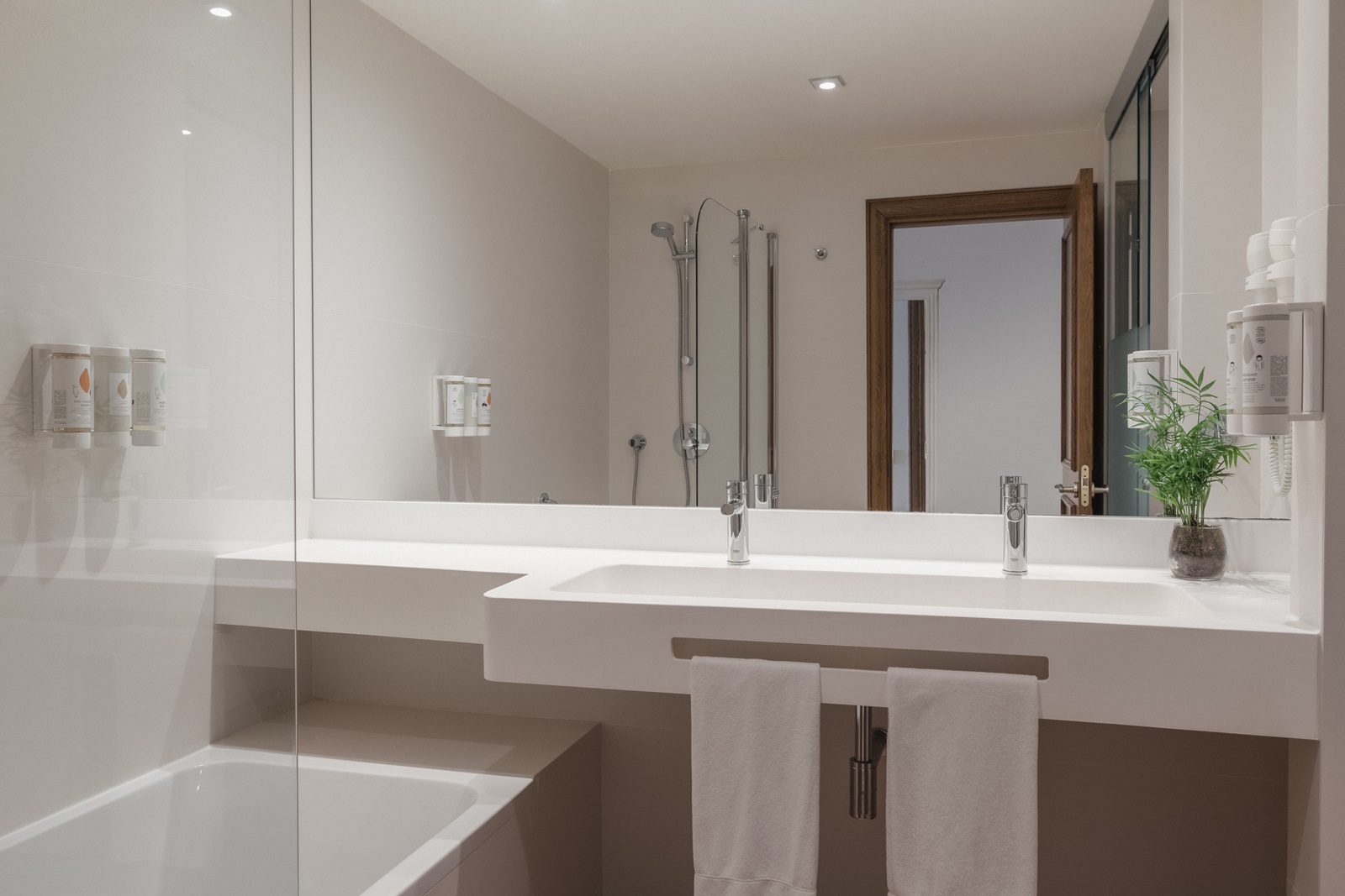 toutes les chambres disposent d'une salle de bain (baignoire/douche, sèche-cheveux), téléphone, télévision à écran plat, wifi, minibar (€), coffre-fort, carrelage, climatisation et balcon ou terrasse