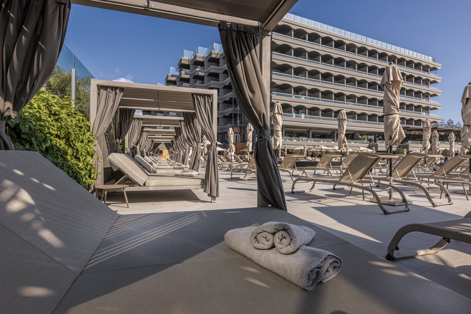 chaises longues, parasols et serviettes aux piscines