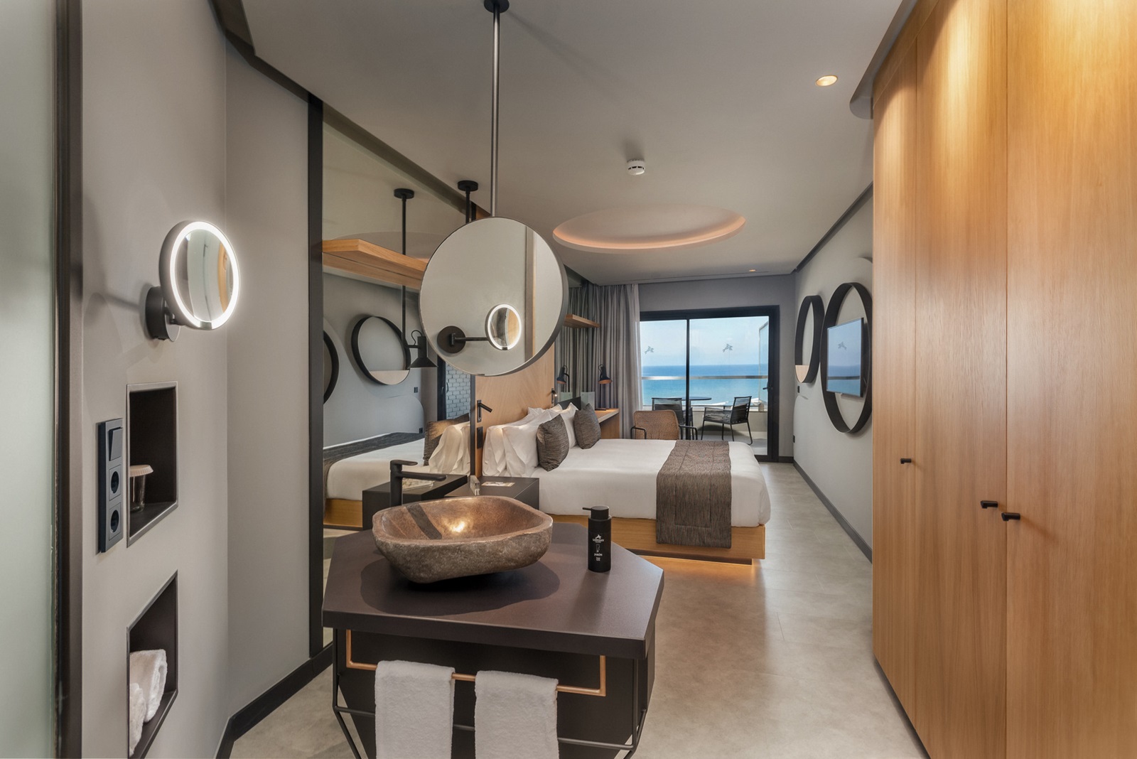 toutes les chambres disposent d'un lit king-size, douche, sèche-cheveux, sorties de bain et pantoufles, coin salon, téléphone, TV satellite, wifi, minibar (€), coffre-fort, climatisation et balcon