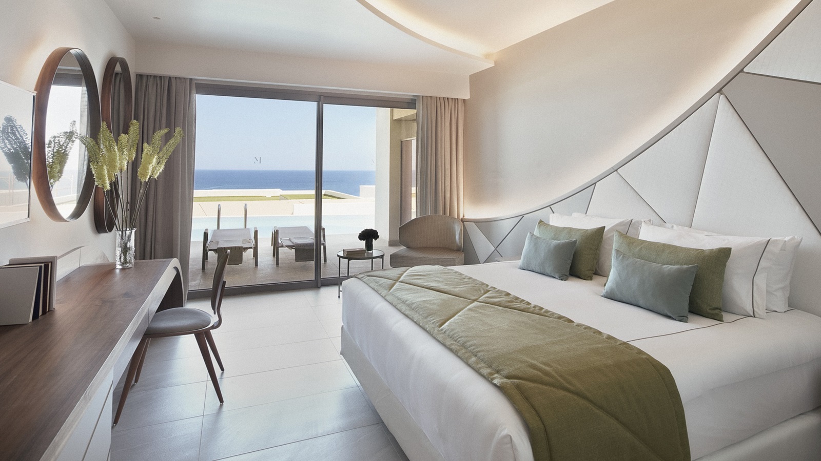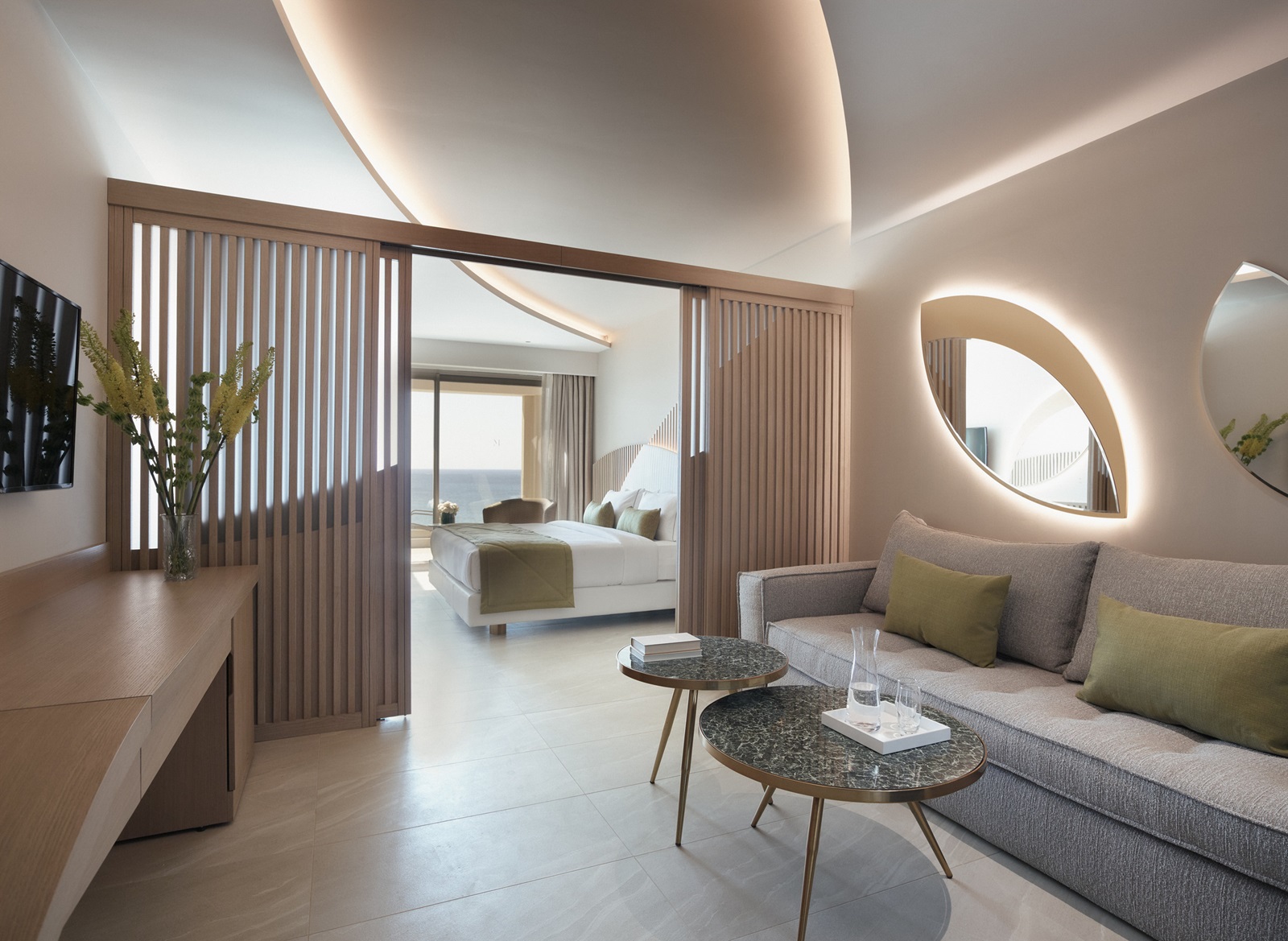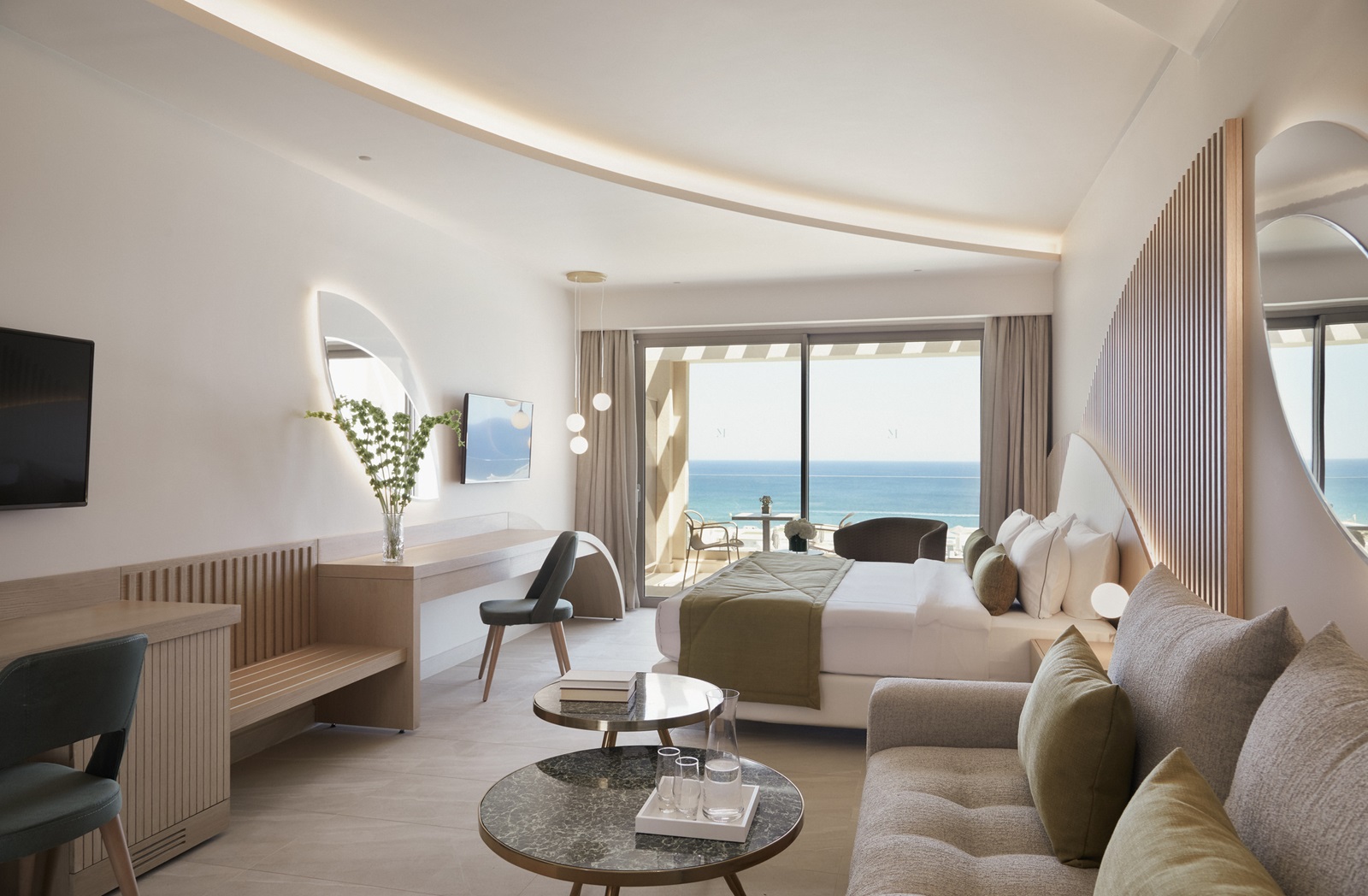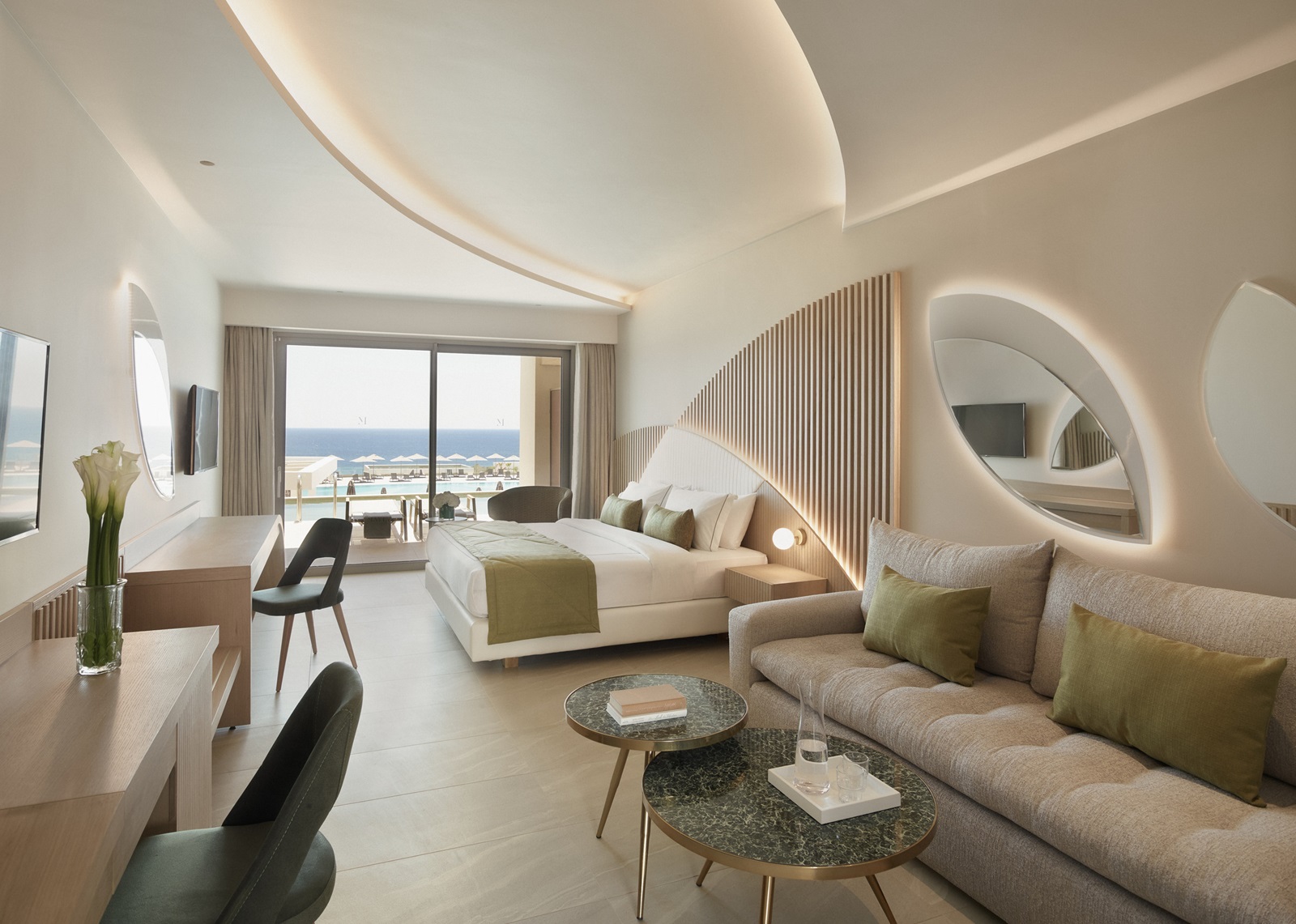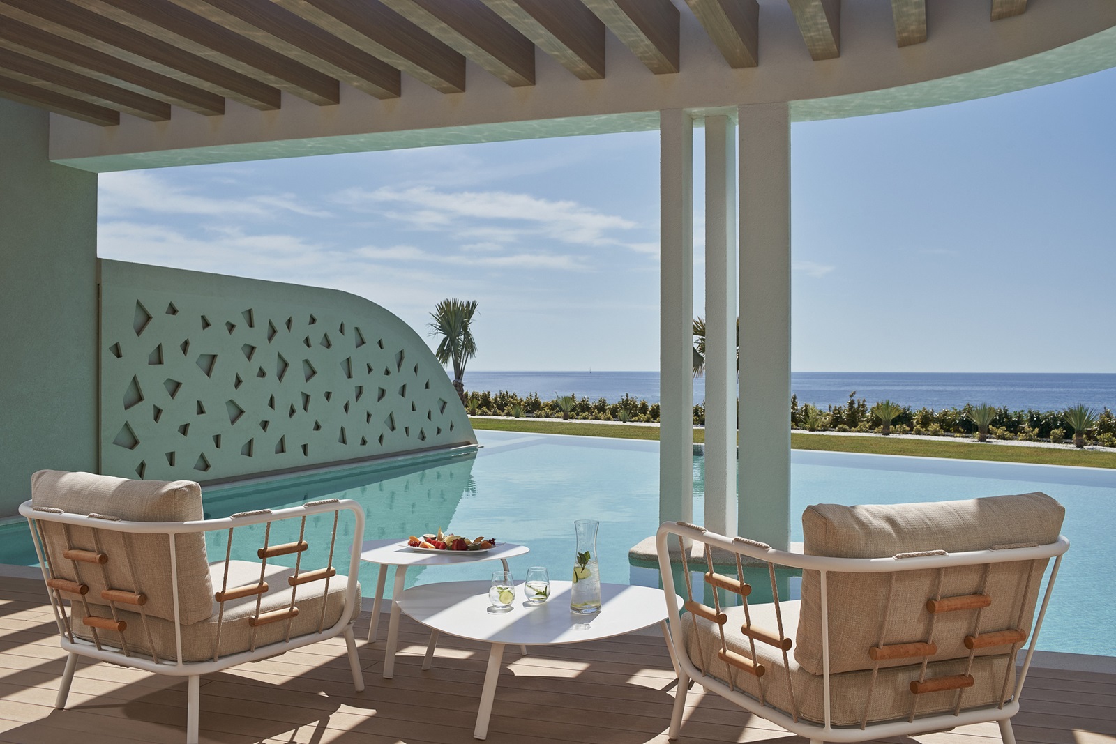 Mayia Suite (48 m²) dans l’annexe avec salon, chambre à coucher séparée, 2 salles de bains, piscine privée et vue mer