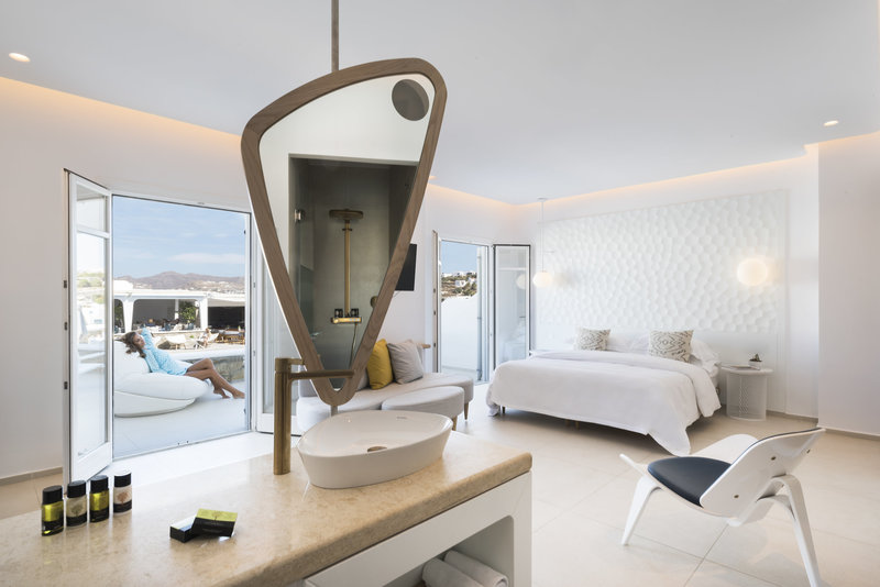 Myconian Kyma est un hôtel-boutique haut de gamme qui offre une vue panoramique sur Myconos. Il a profité récemment d'une magnifique rénovation et fait désormais partie des Design Hotels. Chaque détail de l'intérieur semble avoir été mûrement réfléchi. Les chambres et les suites sont des chefs-d'œuvre minimalistes dominés par les tons blanc et pastel. Le design n'est pas son seul atout. Le centre de thalasso est excellent et le chef travaille exclusivement avec des ingrédients frais de producteurs locaux.