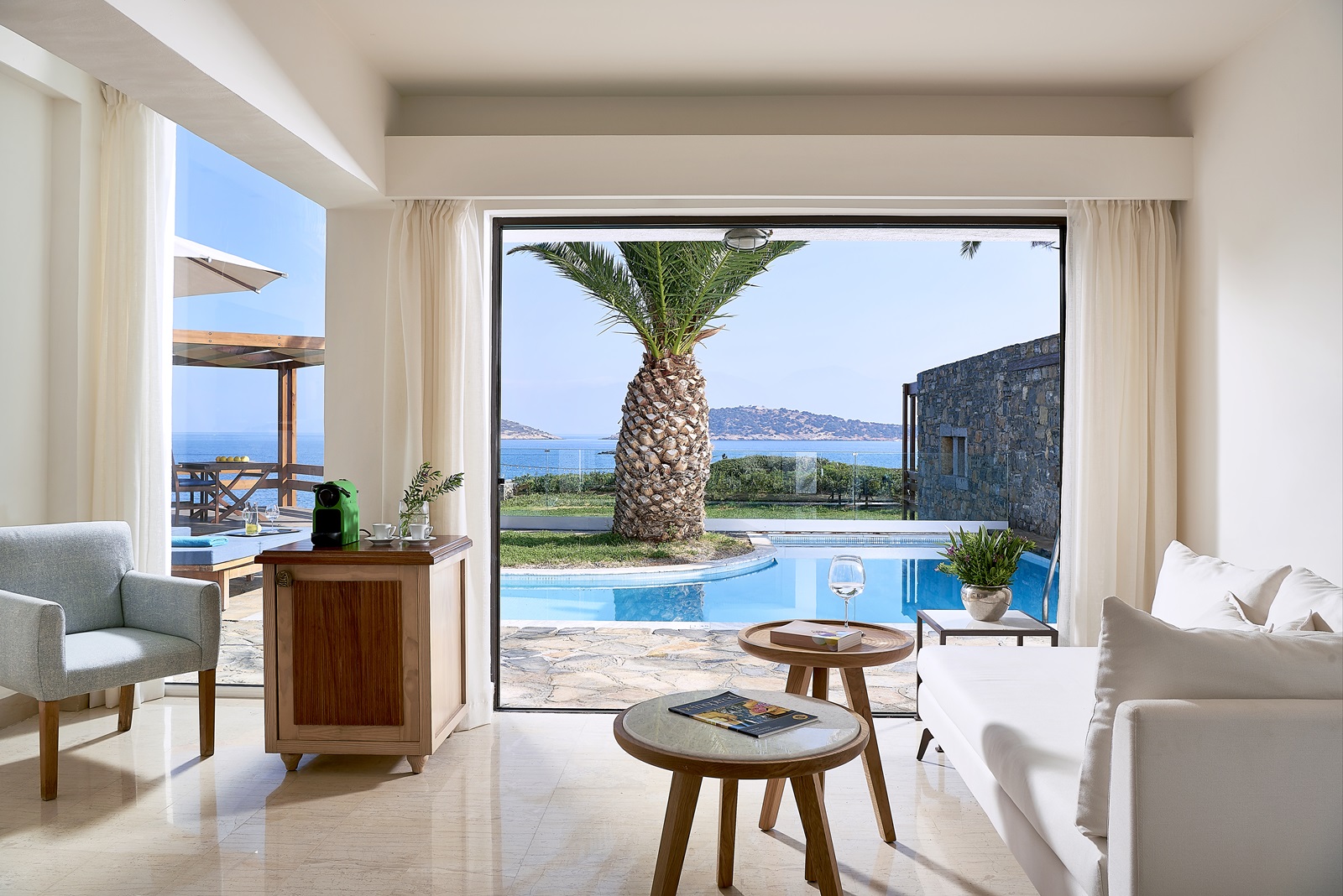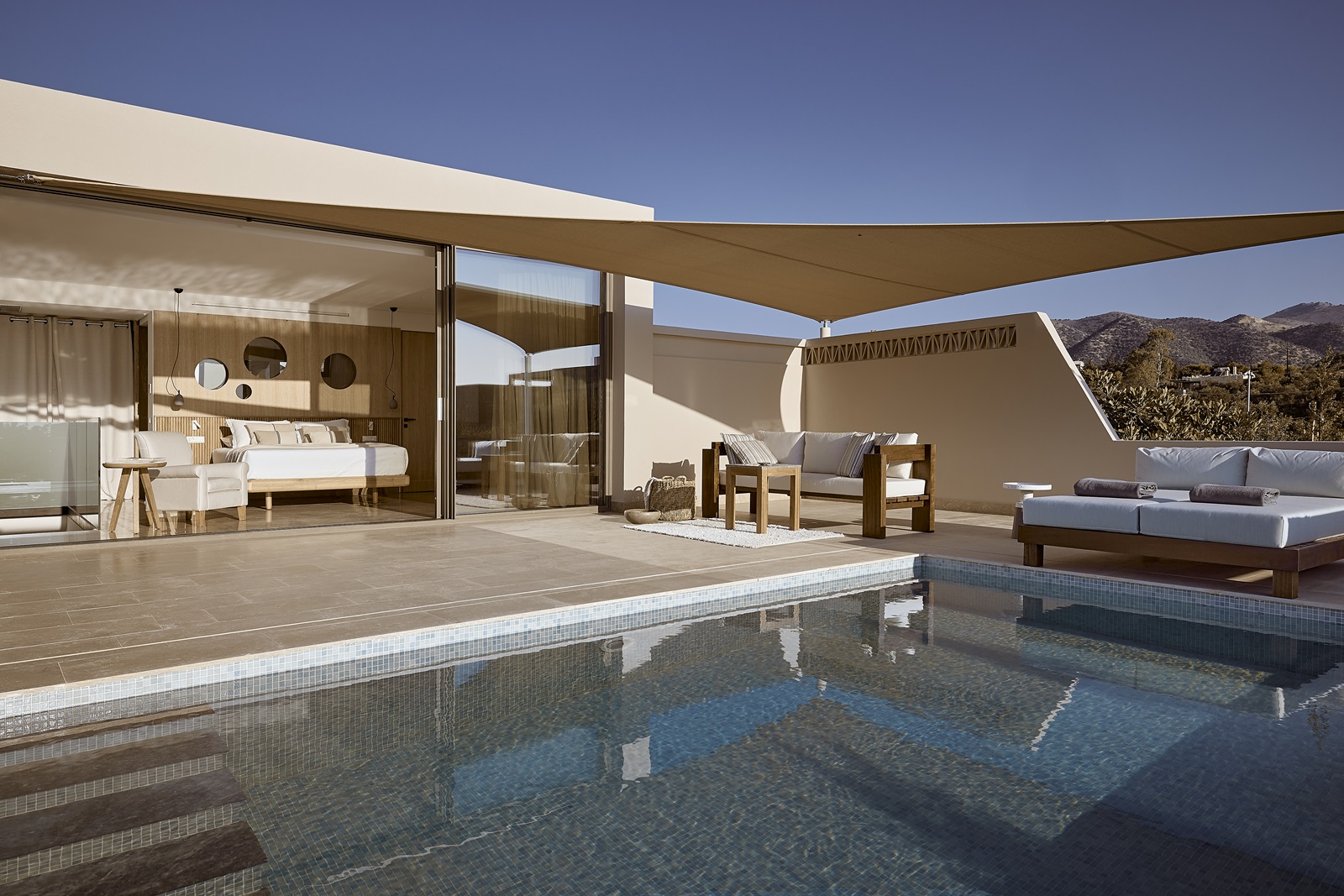 suites 'Classic' (60 m²) avec 2 chambres à coucher séparées, 2 salles de bains (1 avec bain hydromassage), piscine privée et vue mer latérale