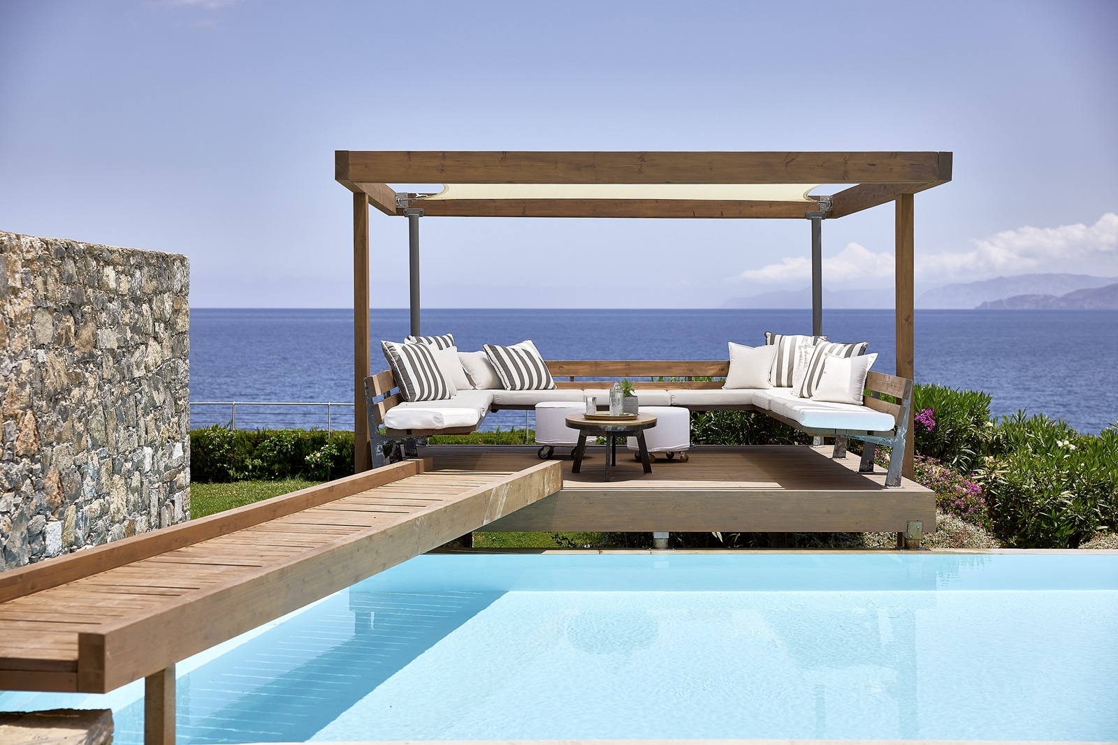 villas Thalassa (155 m²) avec 3 chambres à coucher séparées, lounge, coin à manger, cuisine complètement équipée, bain hydromassage, piscine privée, jardin, terrasse, accès direct à la mer (via un sentier) et vue mer