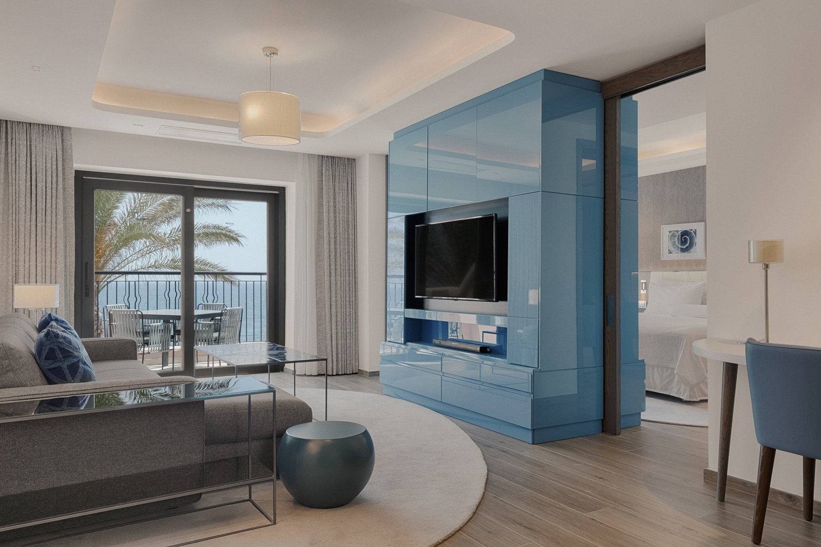 suites Luxury Bay (90 m²) avec salon avec divan-lit, kitchenette, chambre à coucher séparée, 2 salles de bains et grand balcon avec vue mer