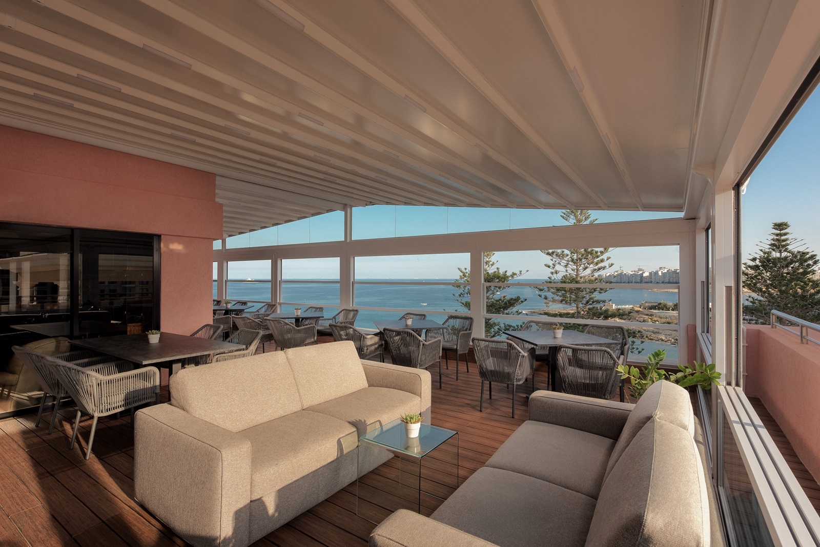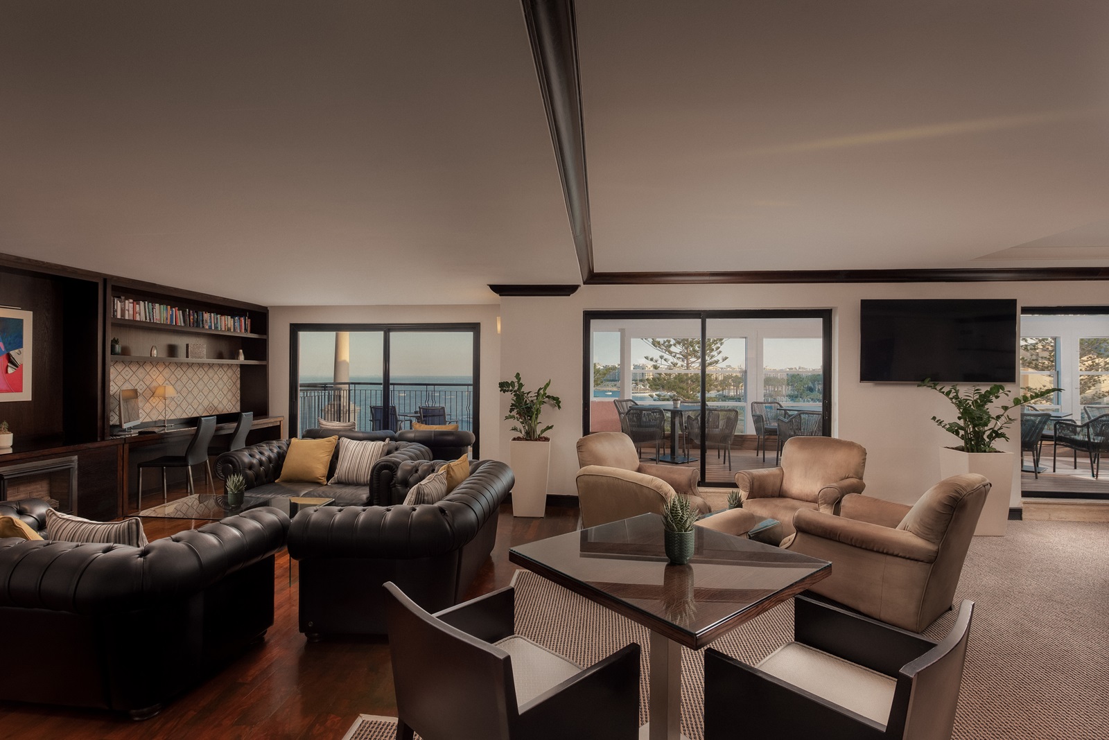 chambres 'Tower' (40 m²) avec grande terrasse (20 m²) avec chaises longues et vue mer