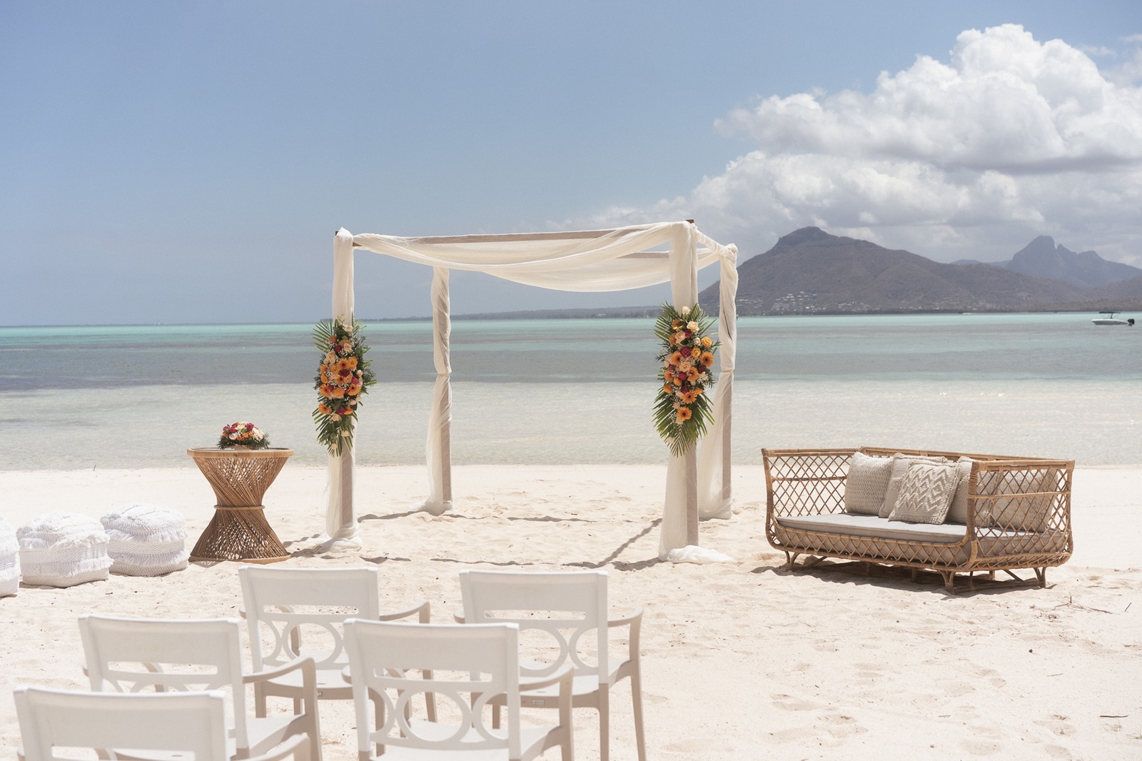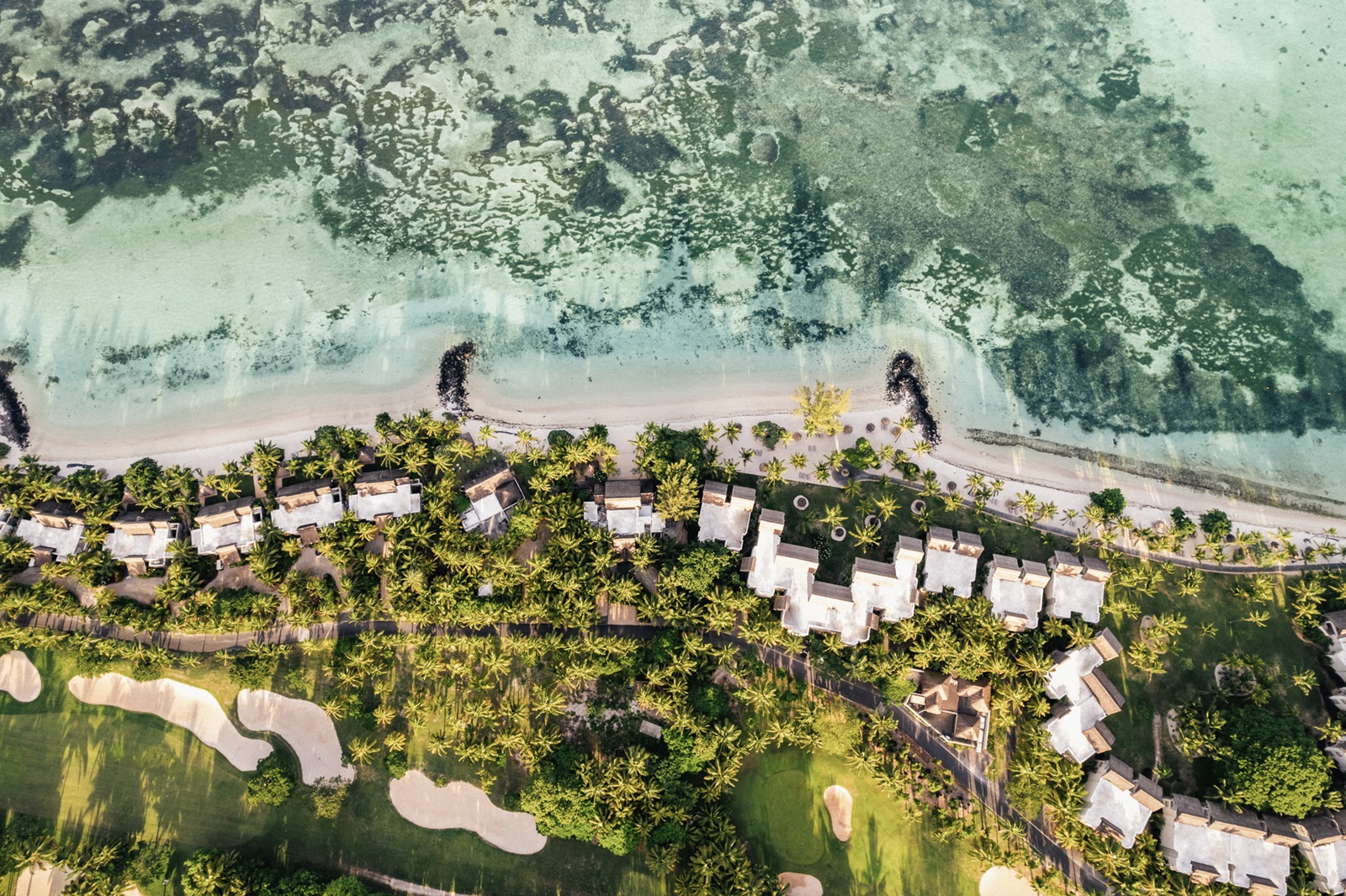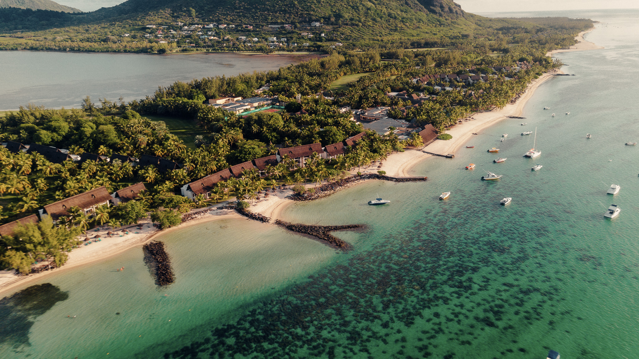 situé au calme sur la Péninsule du Morne, entre le lagon turquoise et le golf 18 trous, avec en arrière-plan la montagne du Morne