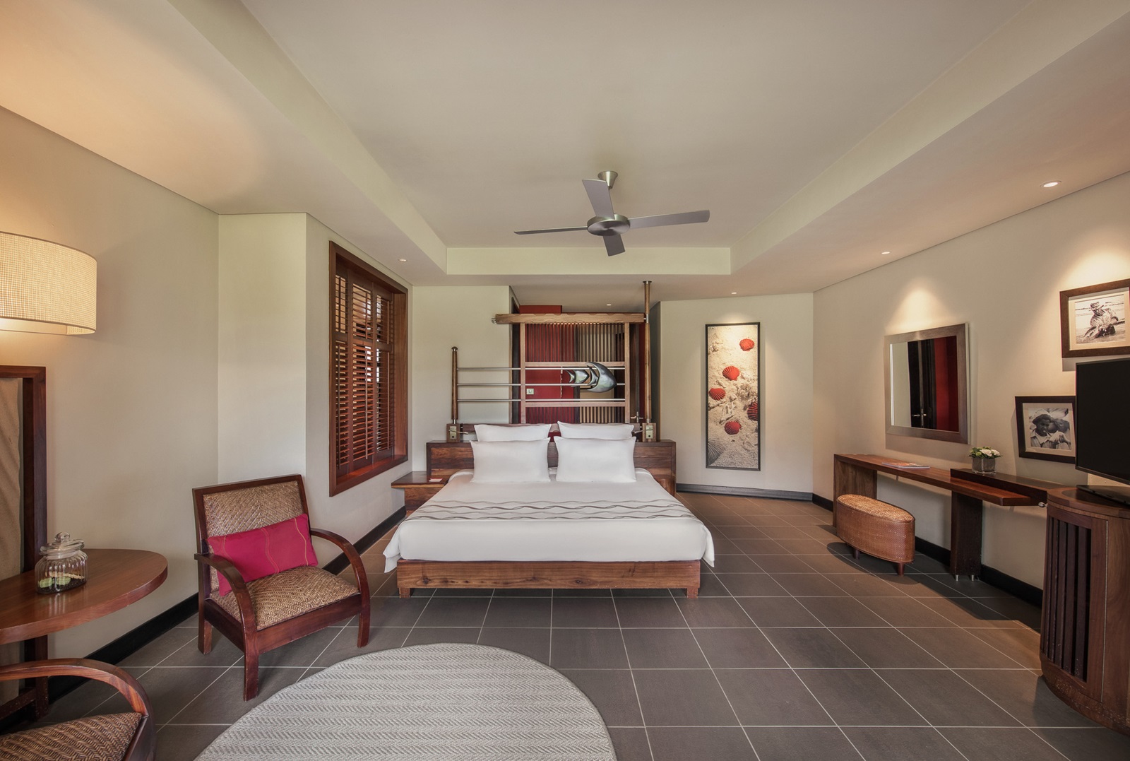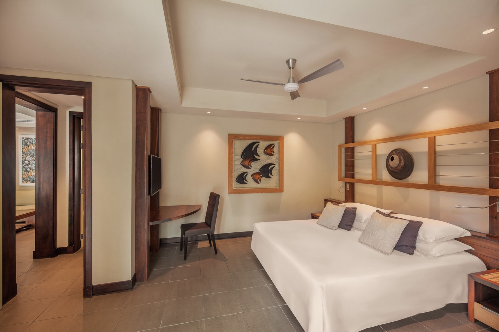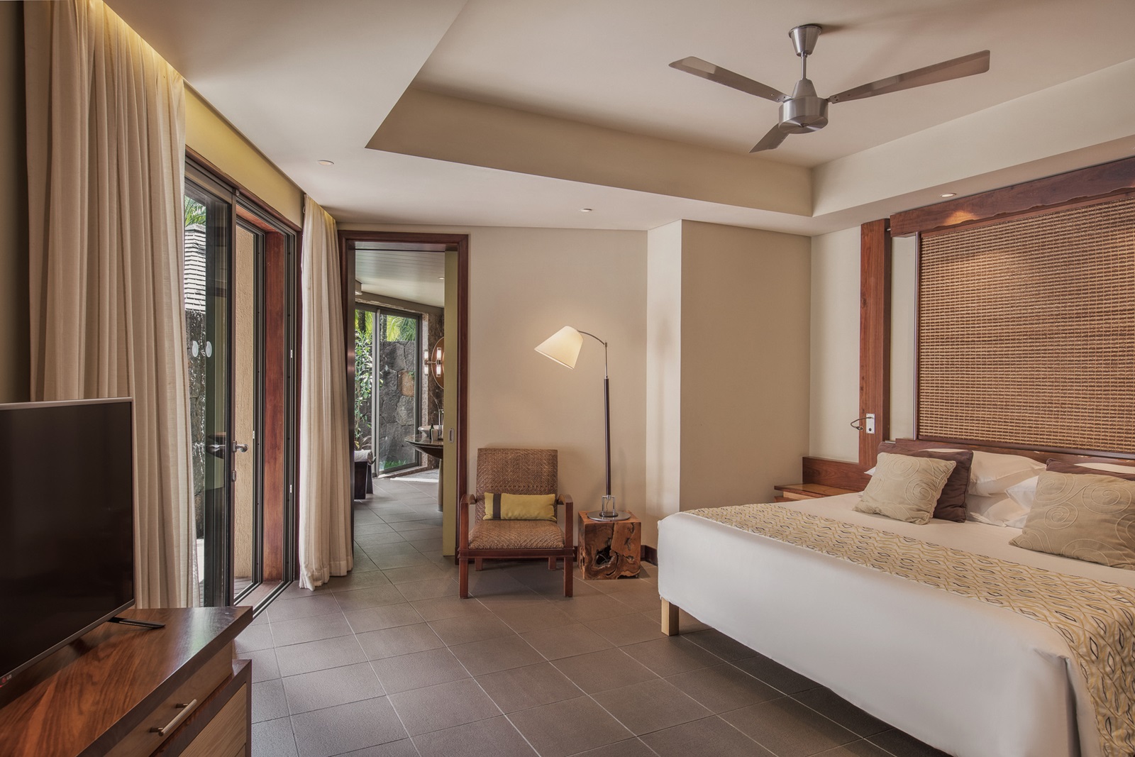 toutes les suites, modernes et spacieuses, sont réparties dans les pavillons individuels de 4 suites, dispersés dans le jardin tropical et disposent d'un bain, douche, sortie de bain, sèche-cheveux, TV-satellite, wifi, minibar (€), coffre-fort, ventilateur de plafond, climatisation, terrasse ou balcon