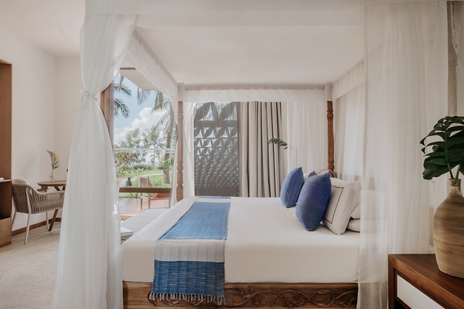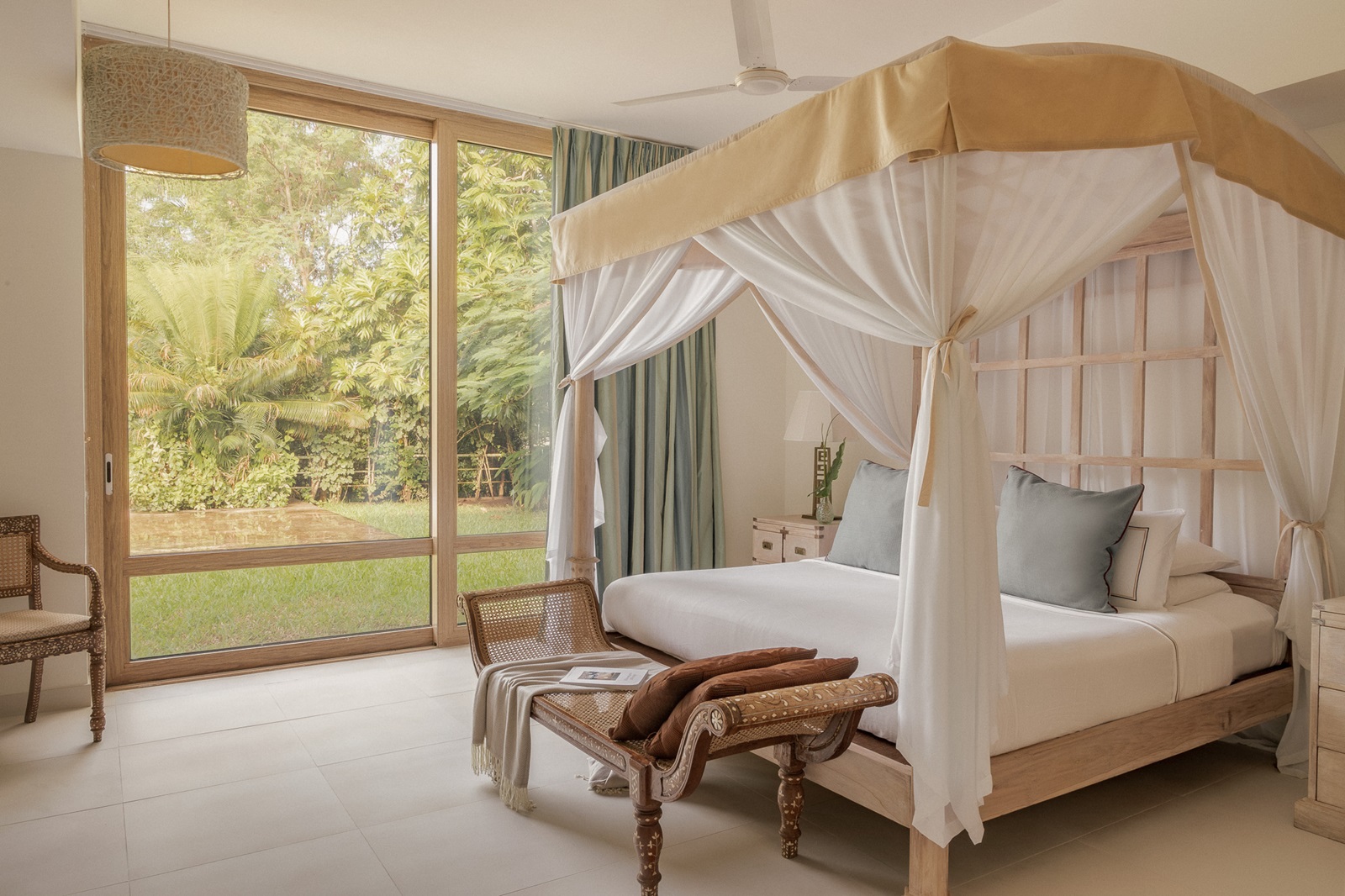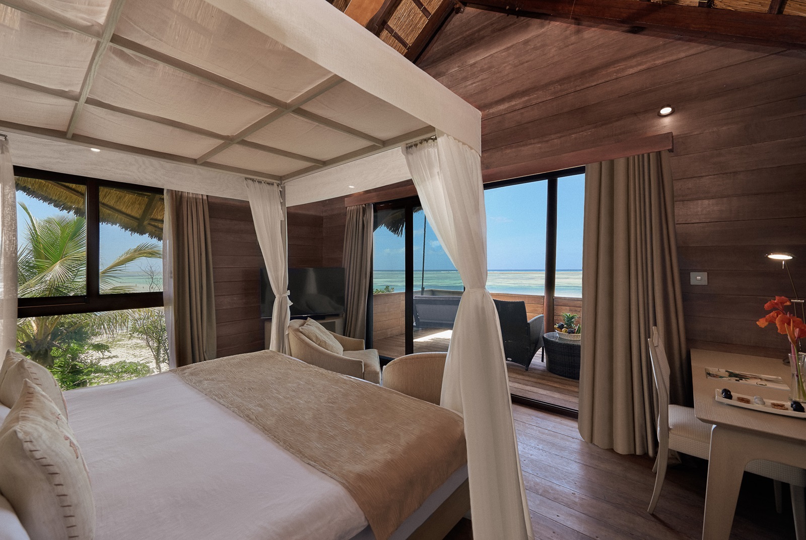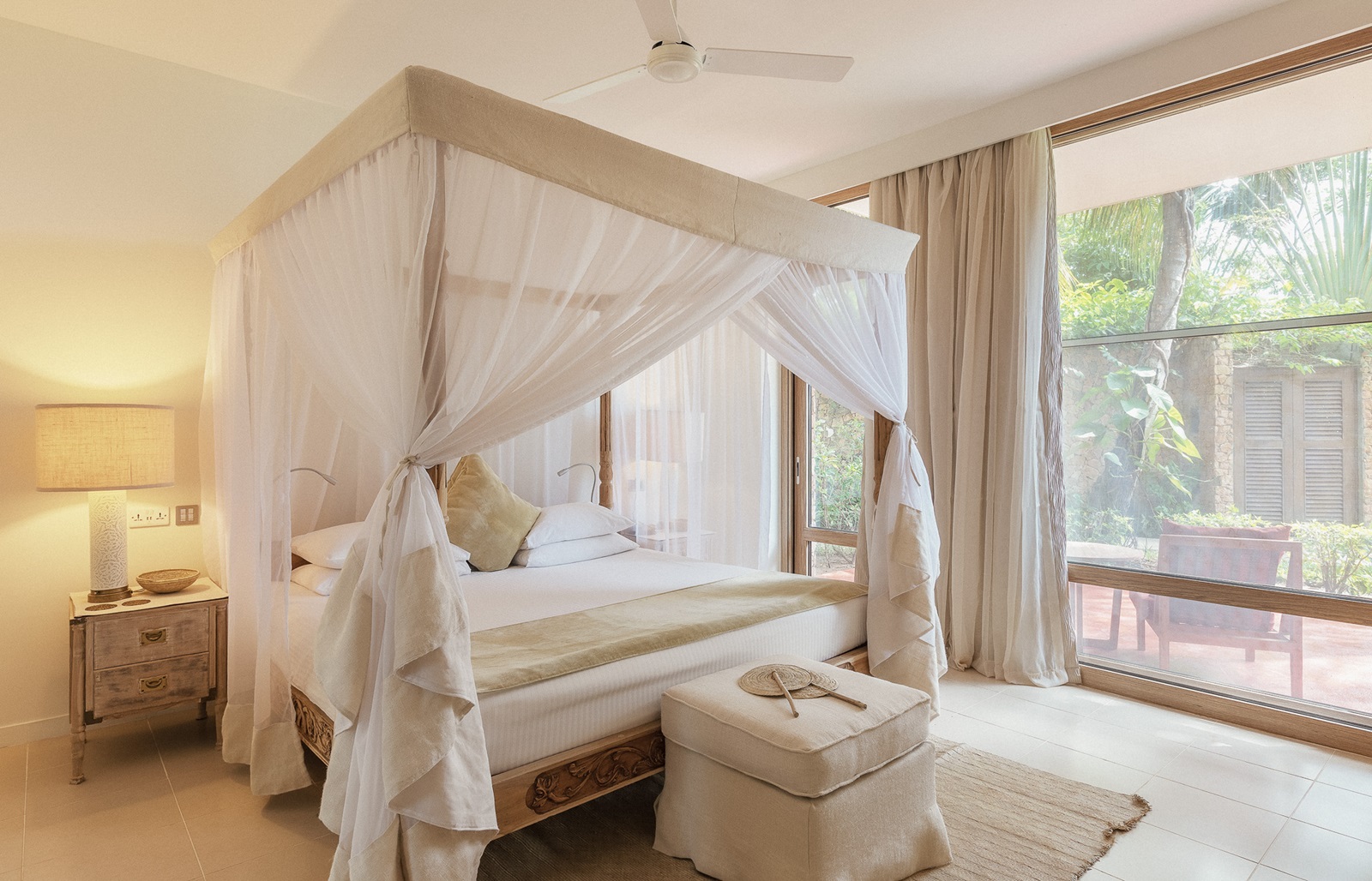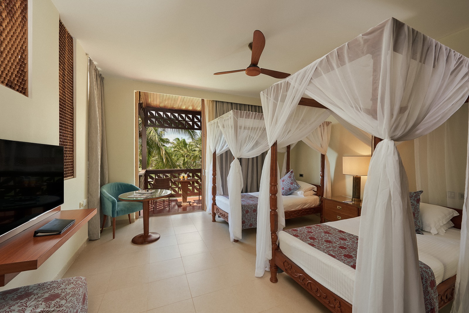 toutes les chambres et suites de style contemporain disposent d’un bain, douche, sèche-cheveux, sorties de bain et pantoufles, téléphone, TV à écran plat, wifi, moustiquaire, coin salon, minibar (€), percolateur à café et à thé, coffre-fort, climatisation, ventilateur au plafond, balcon ou terrasse