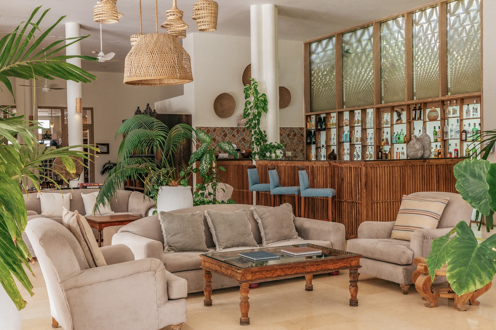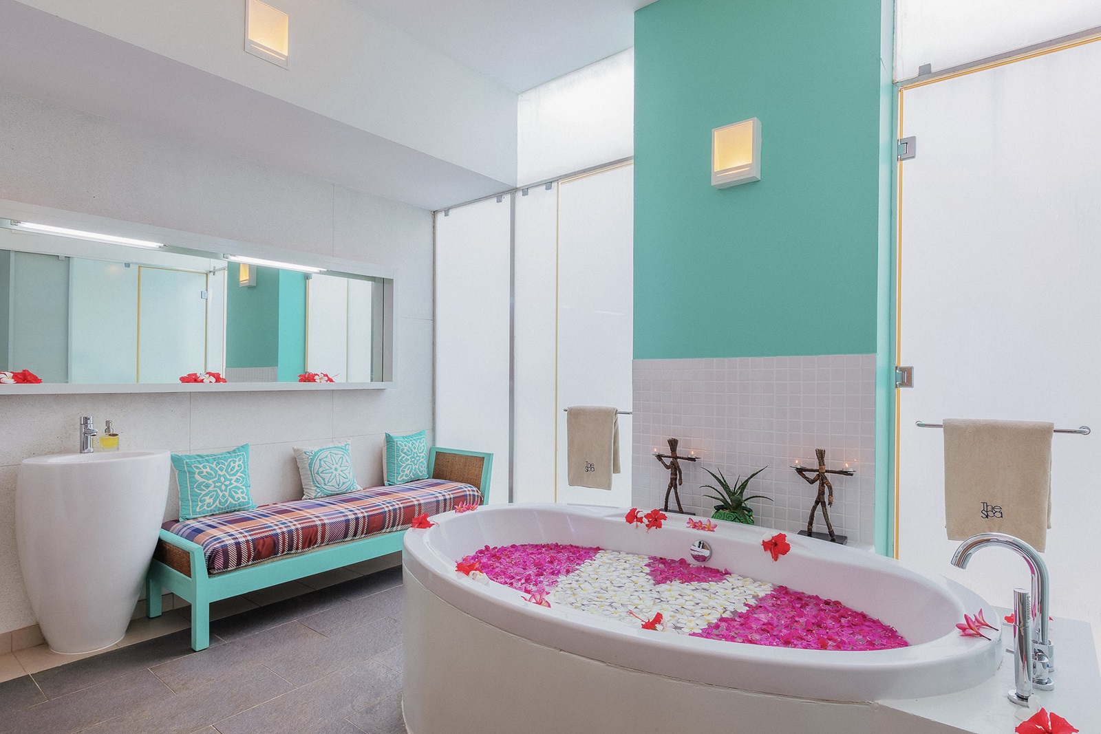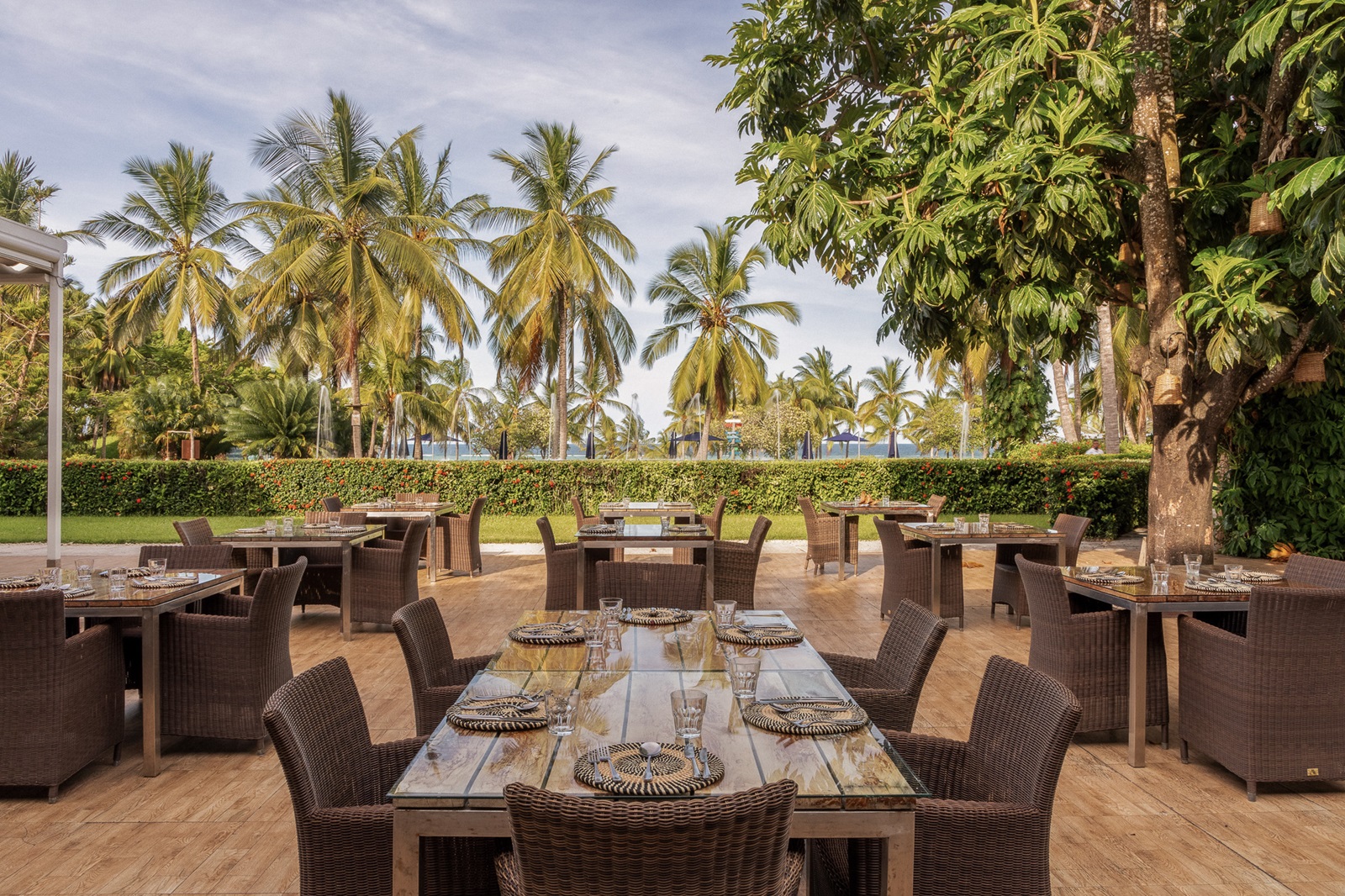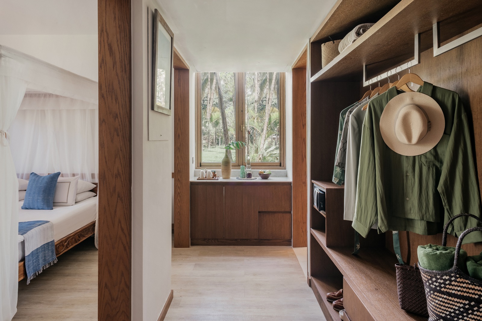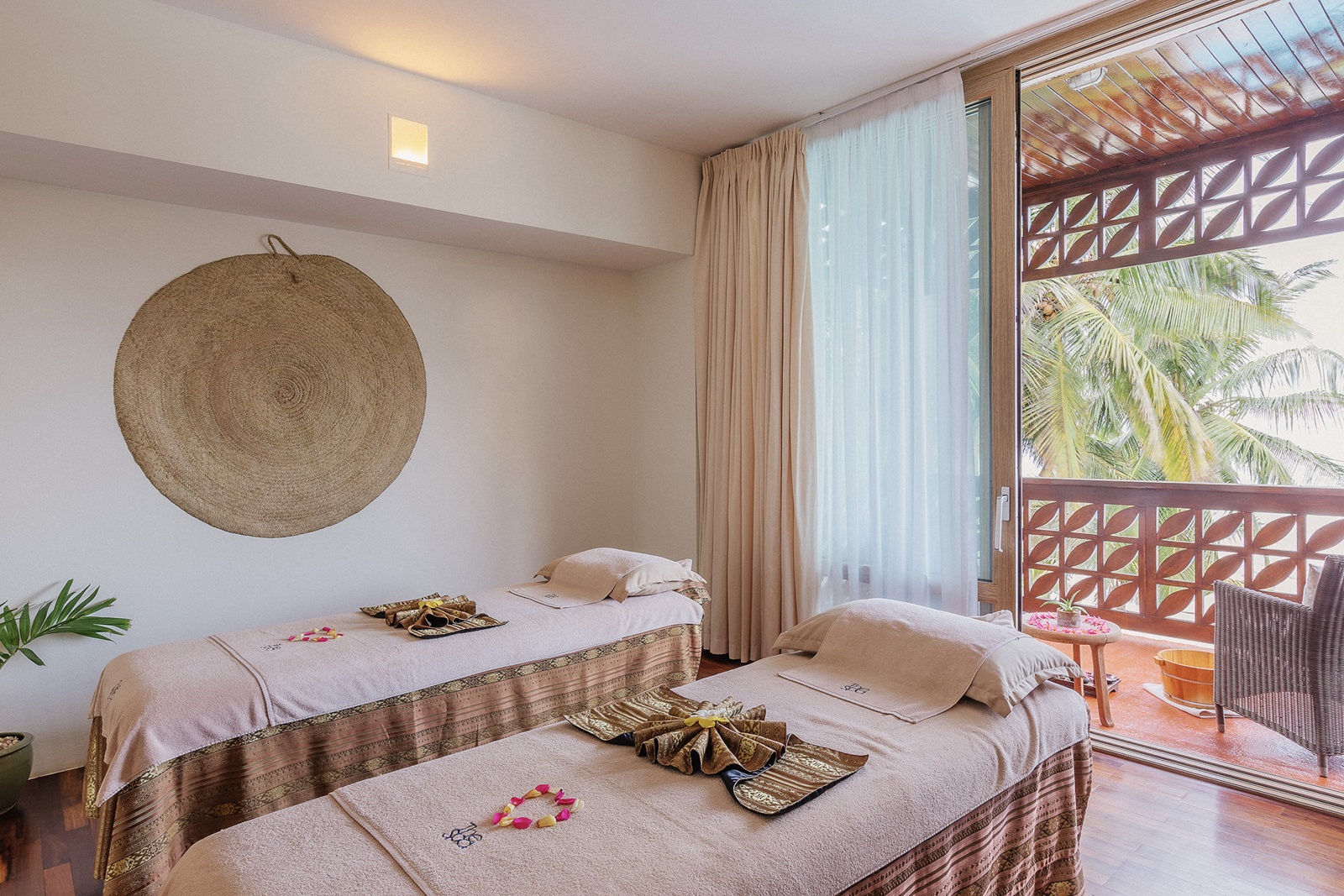 toutes les chambres et suites de style contemporain disposent d’un bain, douche, sèche-cheveux, sorties de bain et pantoufles, téléphone, TV à écran plat, wifi, moustiquaire, coin salon, minibar (€), percolateur à café et à thé, coffre-fort, climatisation, ventilateur au plafond, balcon ou terrasse