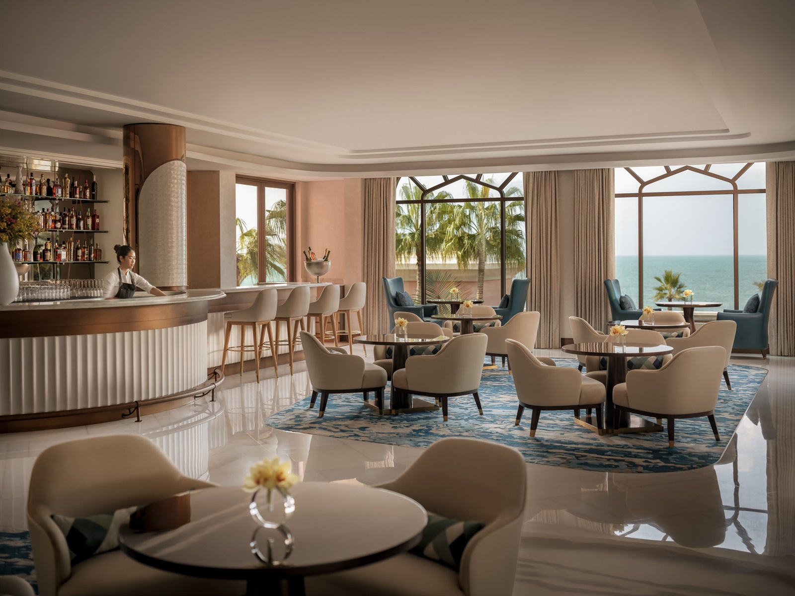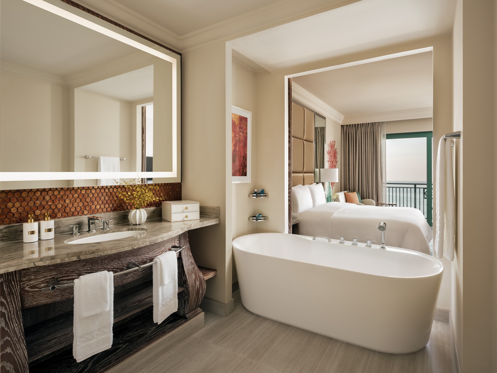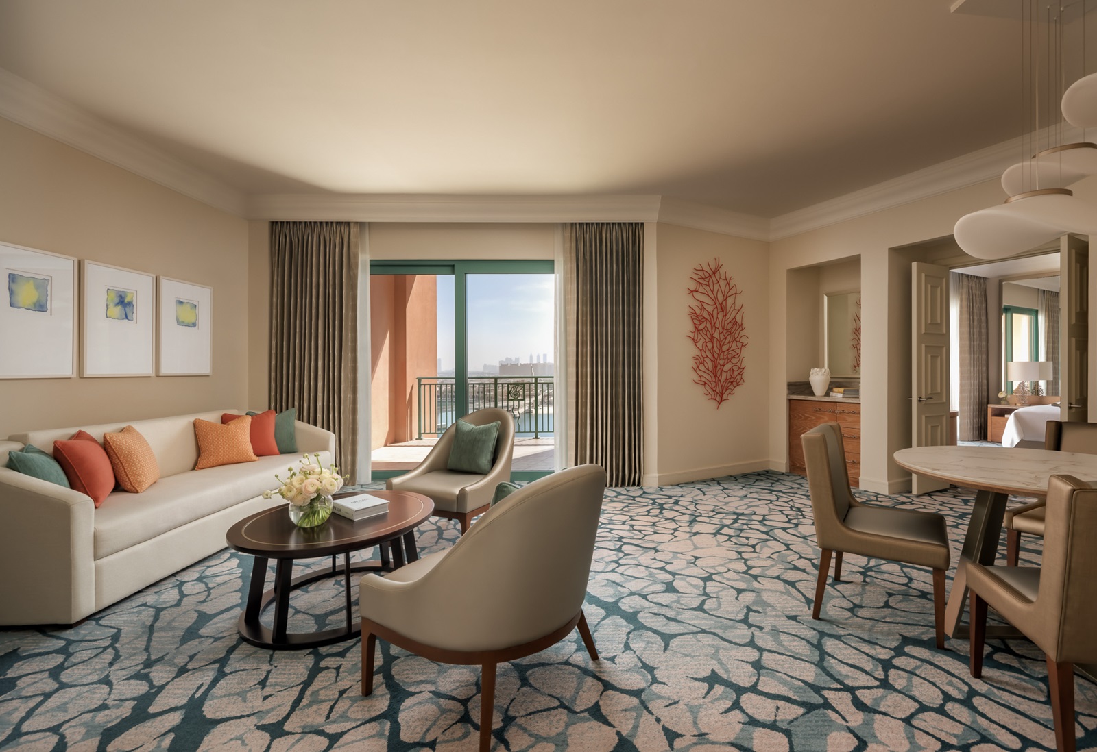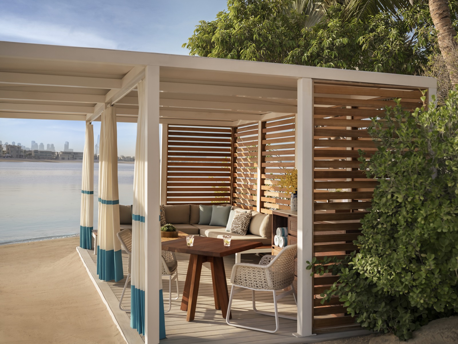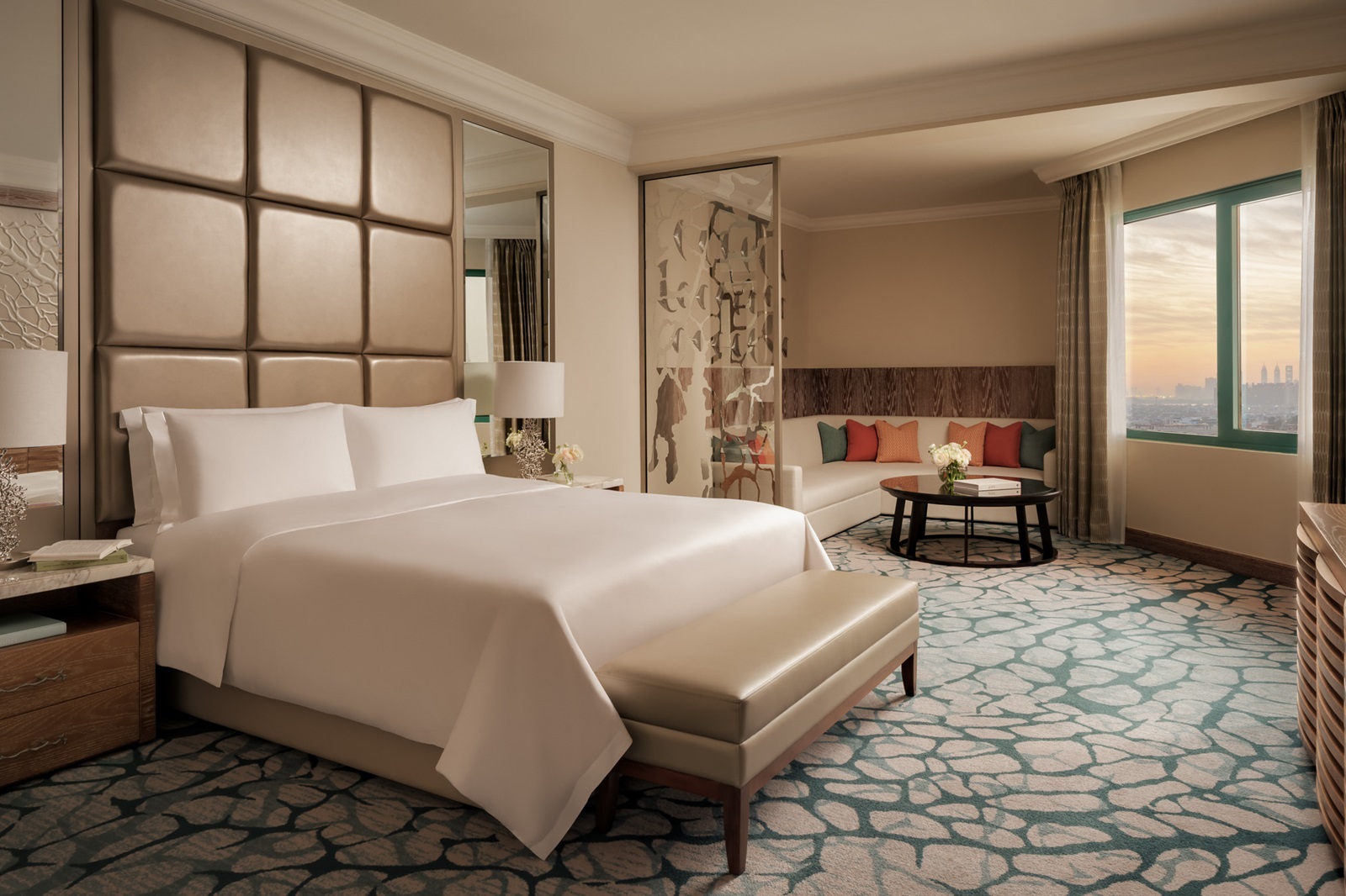de Palm View kamers (45 m²) hebben zicht over de Palm en skyline van Dubai