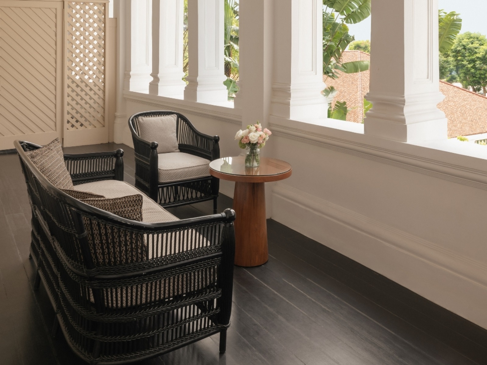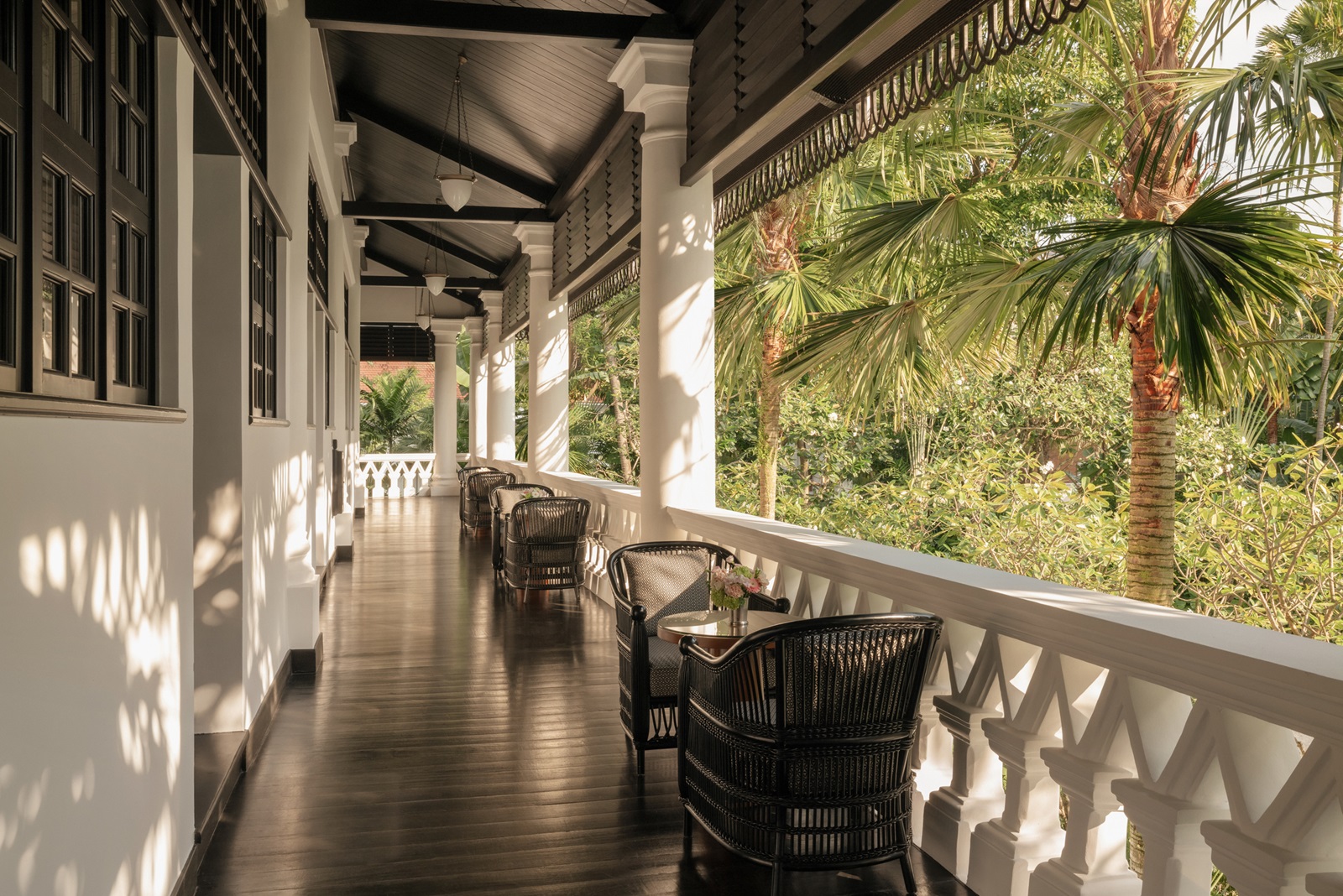 palm court suites (70 m²) gelegen in ‘Palm Court Wing’ met living, aparte slaapkamer en uitzicht over de palm court vanuit de gedeelde veranda