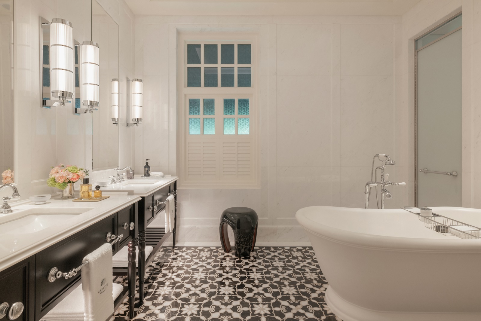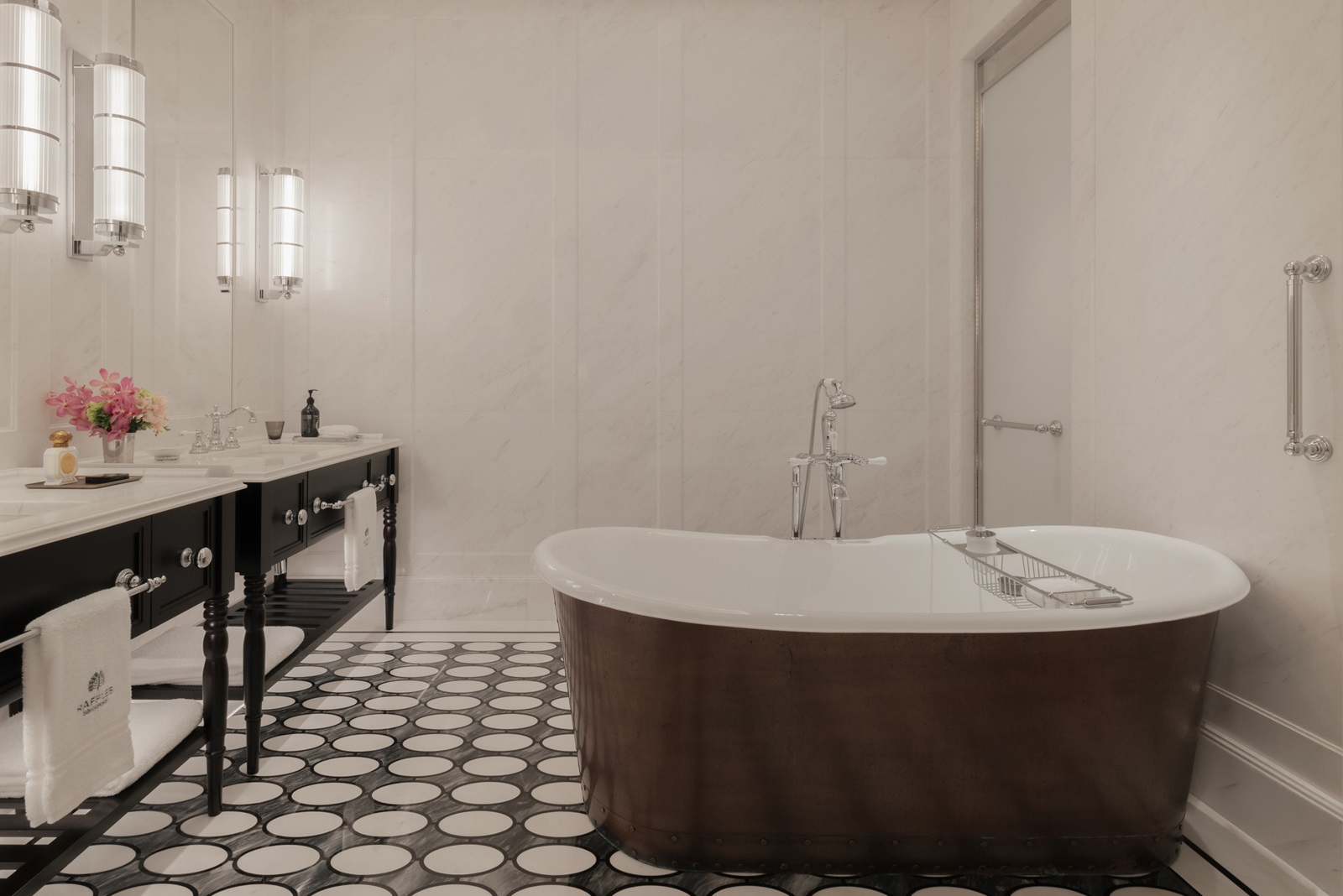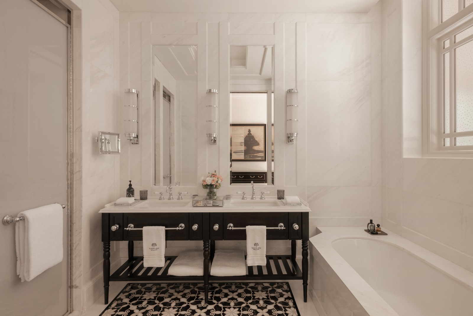 alle kamers in een elegante koloniale stijl hebben een schitterende marmeren badkamer (bad, inloopdouche, haardroger), zithoek, telefoon, flatscreen-tv, wifi, Nespresso®-apparaat, kluisje, minibar (€), airconditioning en 24/7 Raffles butlerservice