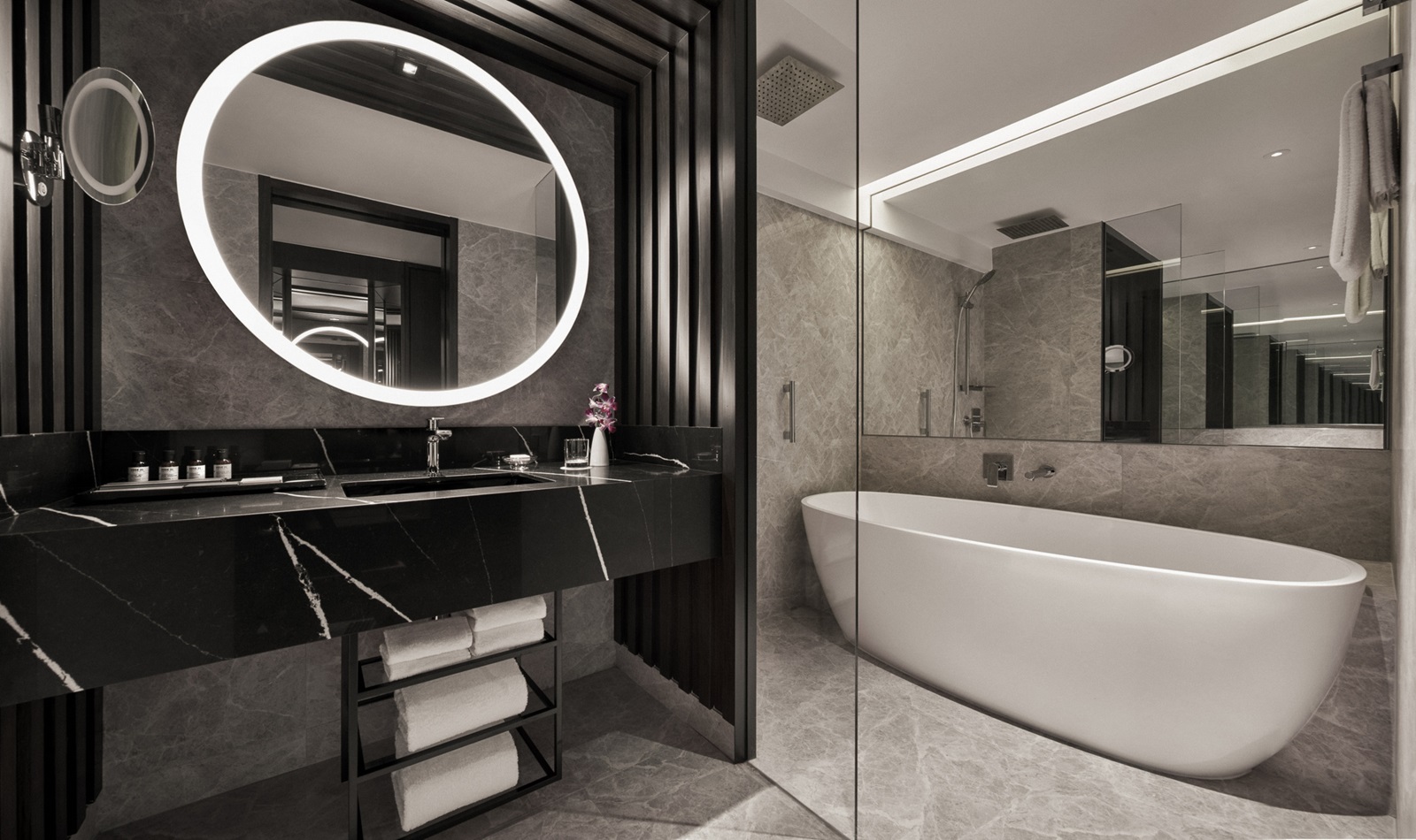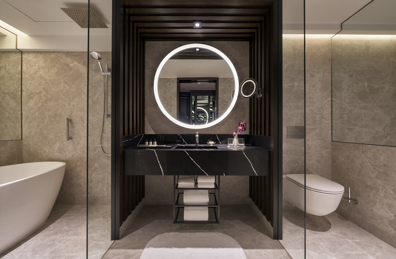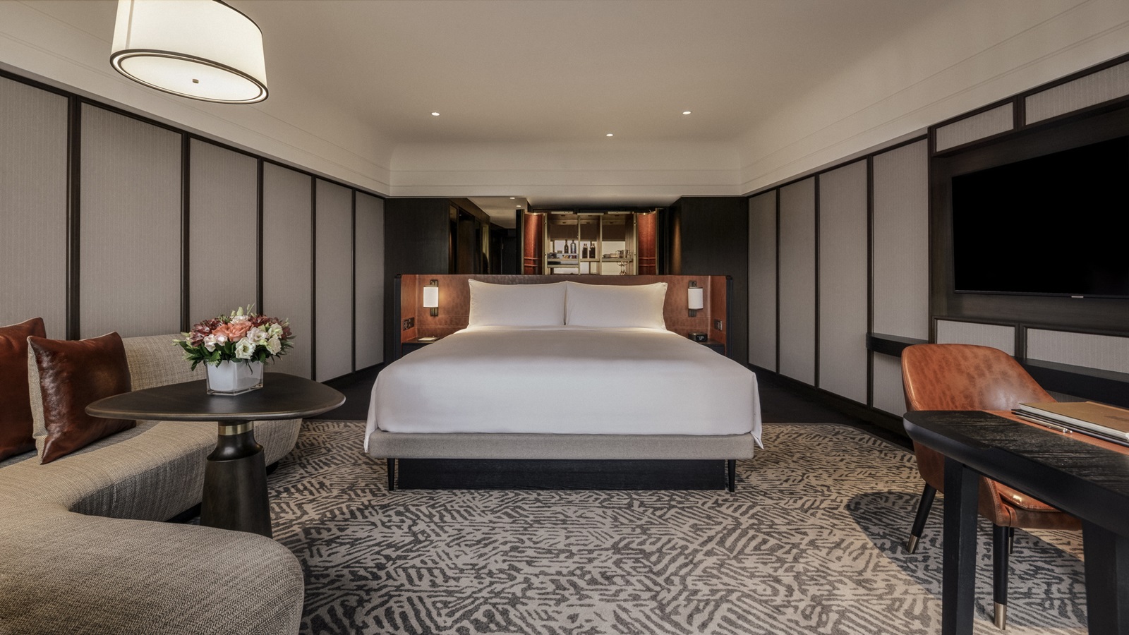 Signature Salon suites (57 m²) met ruime open zithoek en badkamer (ruime douche), aparte dressing en stadszicht